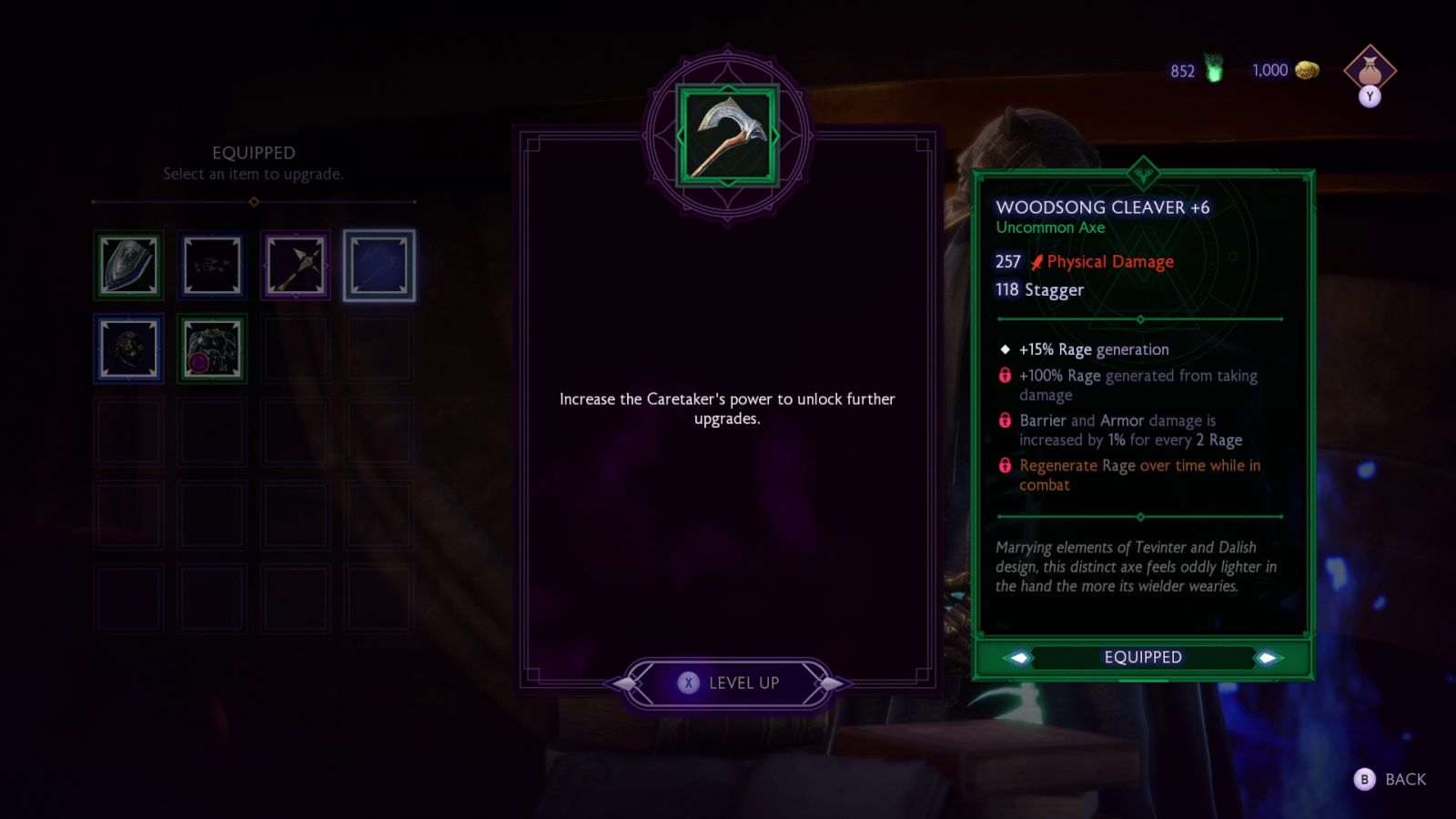 Most of the time your equipment is incomplete when you first receive it. A basic +6 Woodsong Cleaver is a solid axe that can do some physical damage and with a bit of stagger effect. With the first pip unlocked it now has a 15% Rage generation trait. Further upgrades will push that rage generation all the way to 100% as you take damage, whereas a second pip increases barrier and armor damage by 1% for every 2 rage you generate. The final pip regenerates rage over time while in combat, further fueling the combination. This gives your weapons more purposeful longevity, rather than swapping them out frequently.