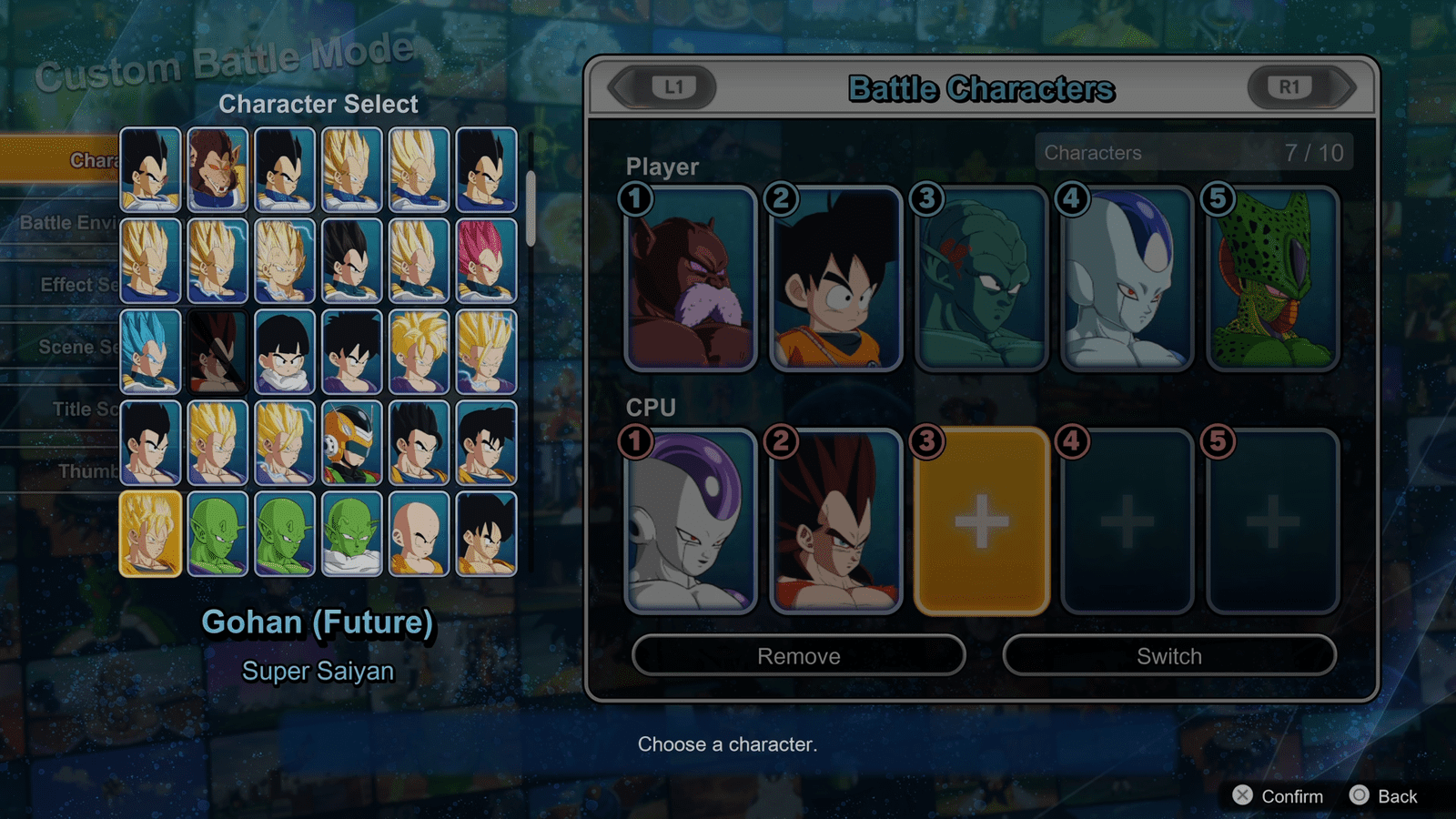 Of course, you don’t need to let the game do any narrative lifting at all if you’d rather do it yourself. Sparking Zero features a Custom Battle mode that is surprisingly extensive. Basically, this mode lets you customize, intros, outros, dialogue, and even battle conditions. You can even give your battles a start of the episode title card! The dialogue and the titles involve a somewhat quirky twist: you can’t just type it yourself, and instead need to pick from a list of pre-selected phrases. It works in an awkward kind of way, but if I’m being honest it’s not an ideal compromise.