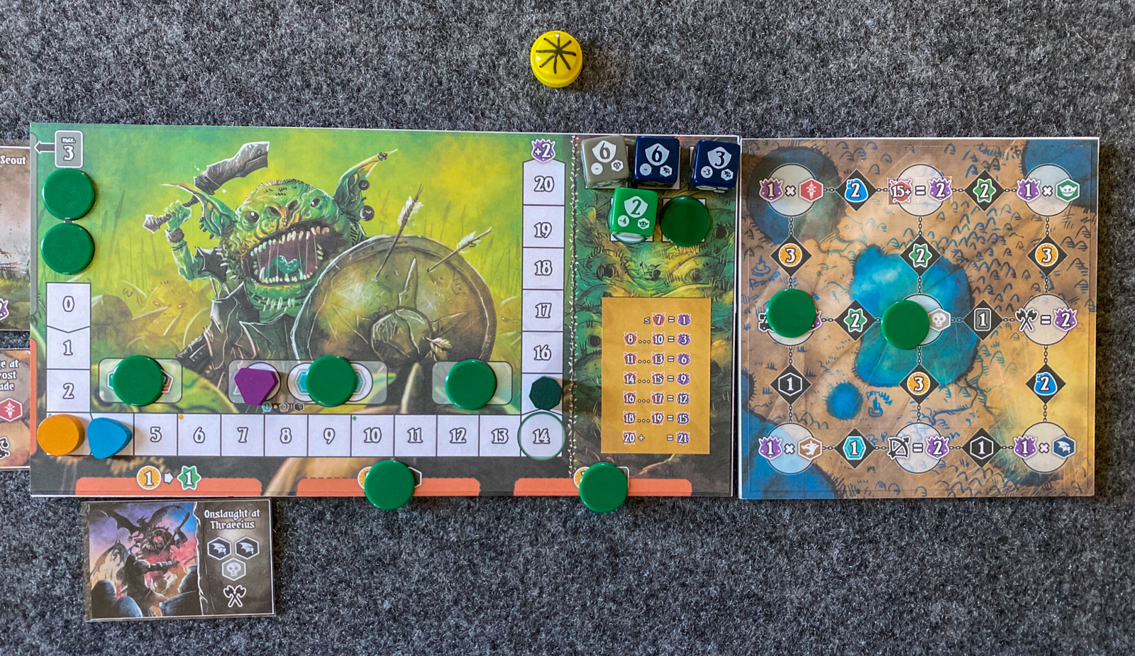 While the central game board is where players get stuff (troops, champions, resources, etc.), the two-piece player mat is where everything happens. The faction board tracks your game currencies, houses your troops after they get recruited, and -as more battles are won- reveals unlockable abilities in much the same way that Stonemaier’s Scythe handles upgrades. The campaign board tracks your battles with nine skirmish areas, each with their own bonus (though only seven of them will get used). As battles are fought, a marker from the faction board is removed to reveal a new ability (ex.: increase capacity for troop dice from three to four), and then placed on the desired skirmish area, conferring a bonus depending on a matching element of the battle plan (ex.: 2 bonus victory points for a siege battle plan). As the campaign board fills up, chain bonuses are triggered by covering adjacent skirmish areas.