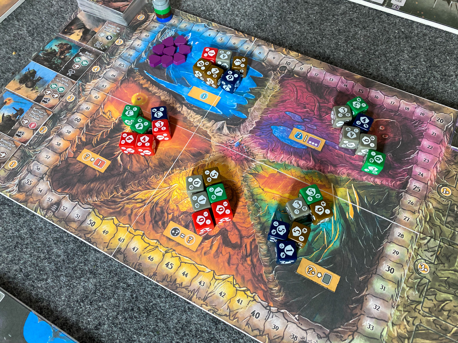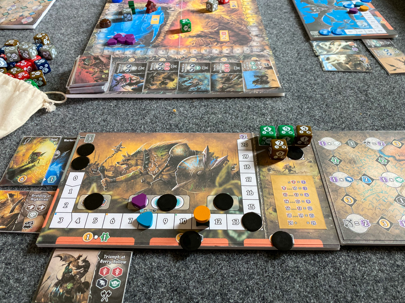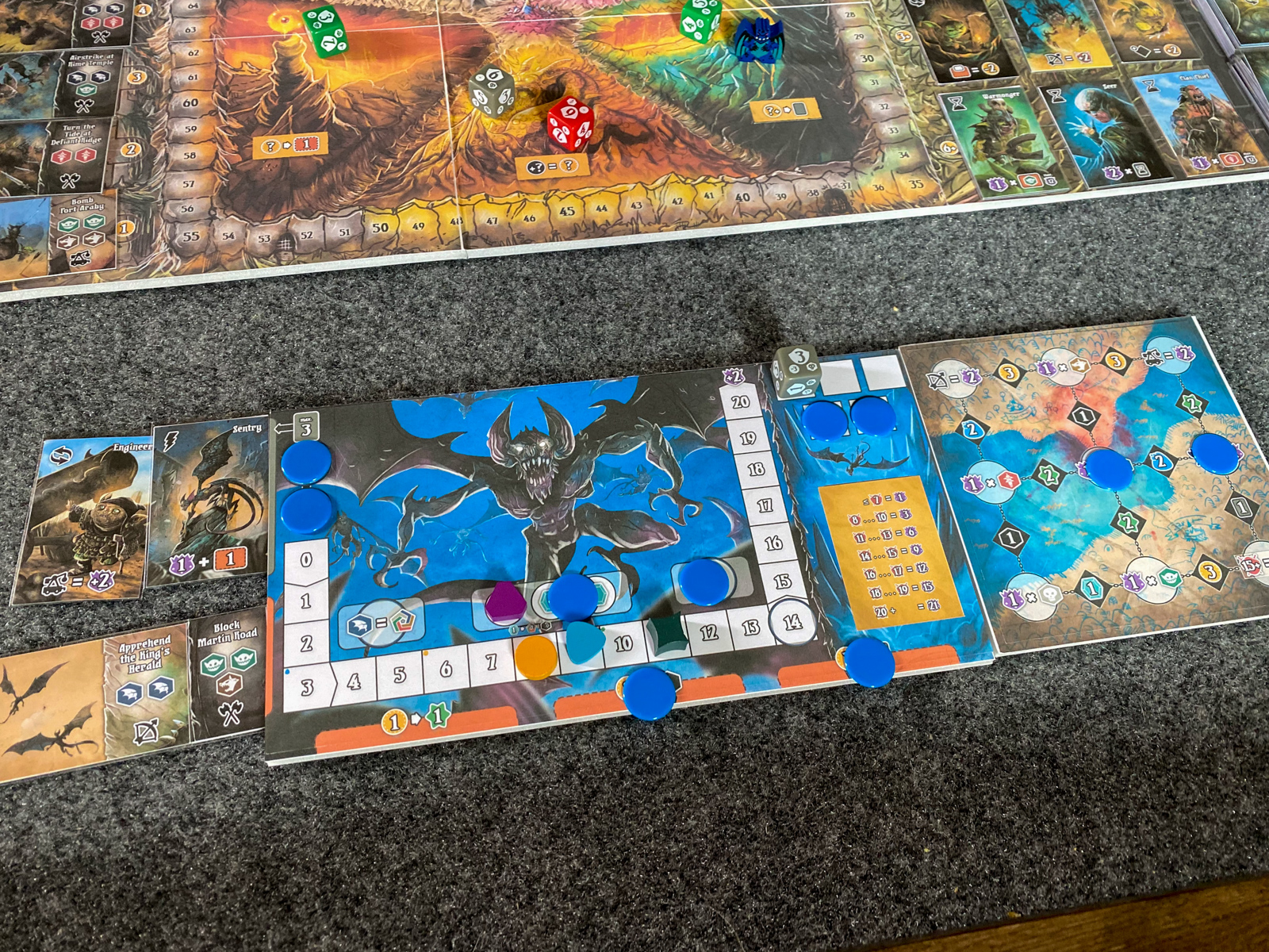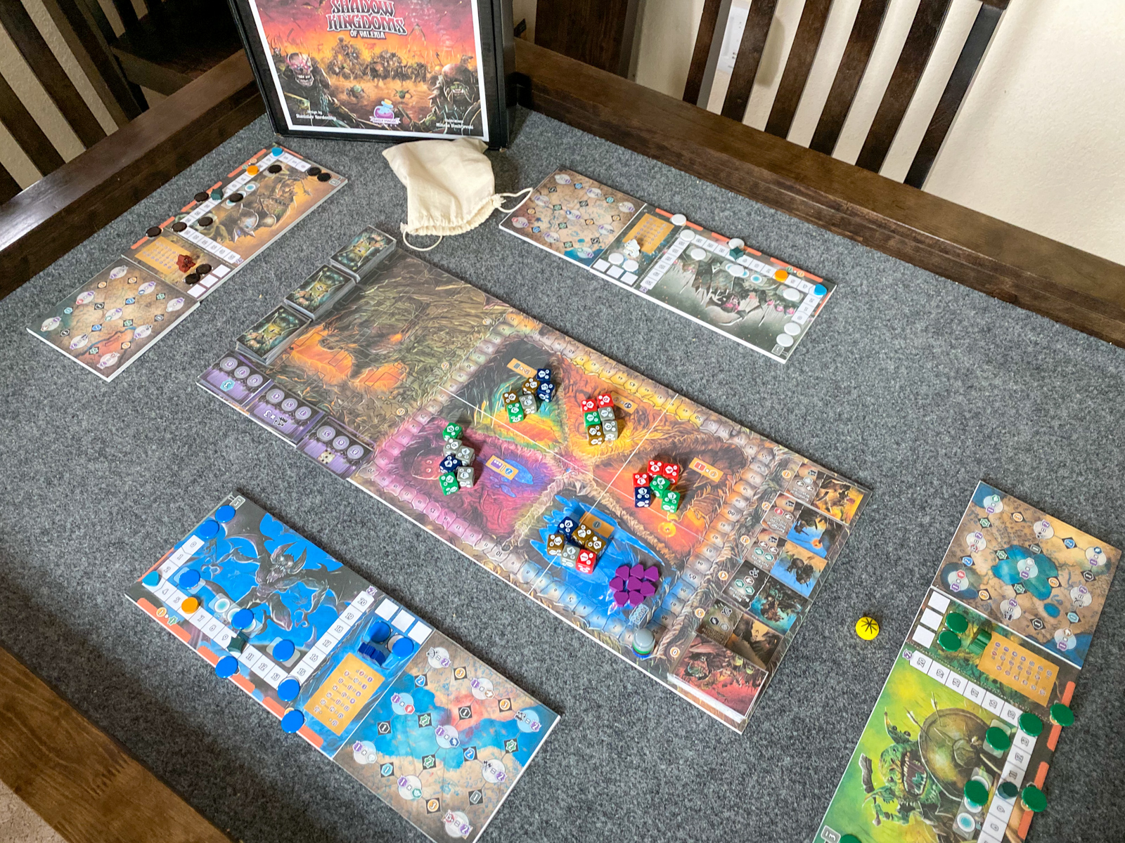 First off, this is not a card-driven experience like the previous Valeria games. Shadow Kingdoms of Valeria is at its core a dice drafting engine-building game. Each player controls a Warden of the Shadow Kingdoms, taking turns visiting the five shrines to collect troop dice, recruiting champions, gaining gems, magic and gold, and purchasing battle plan cards along the way. Each warden represents one of the five troop factions on the dice: Orc (red), Gargoyle (blue), Goblin (green), Skeleton (grey), and Gnoll (brown). Players must move their Warden each turn to one of the dice-occupied shrines or to the camp area on their player board to initiate a battle plan. Battles are fought, with victory points awarded determined by troop strength and bonuses awarded through the campaign board and/or champion cards. Once a player completes their seventh battle plan, the game is ended and victory points are tallied to reveal the winner.