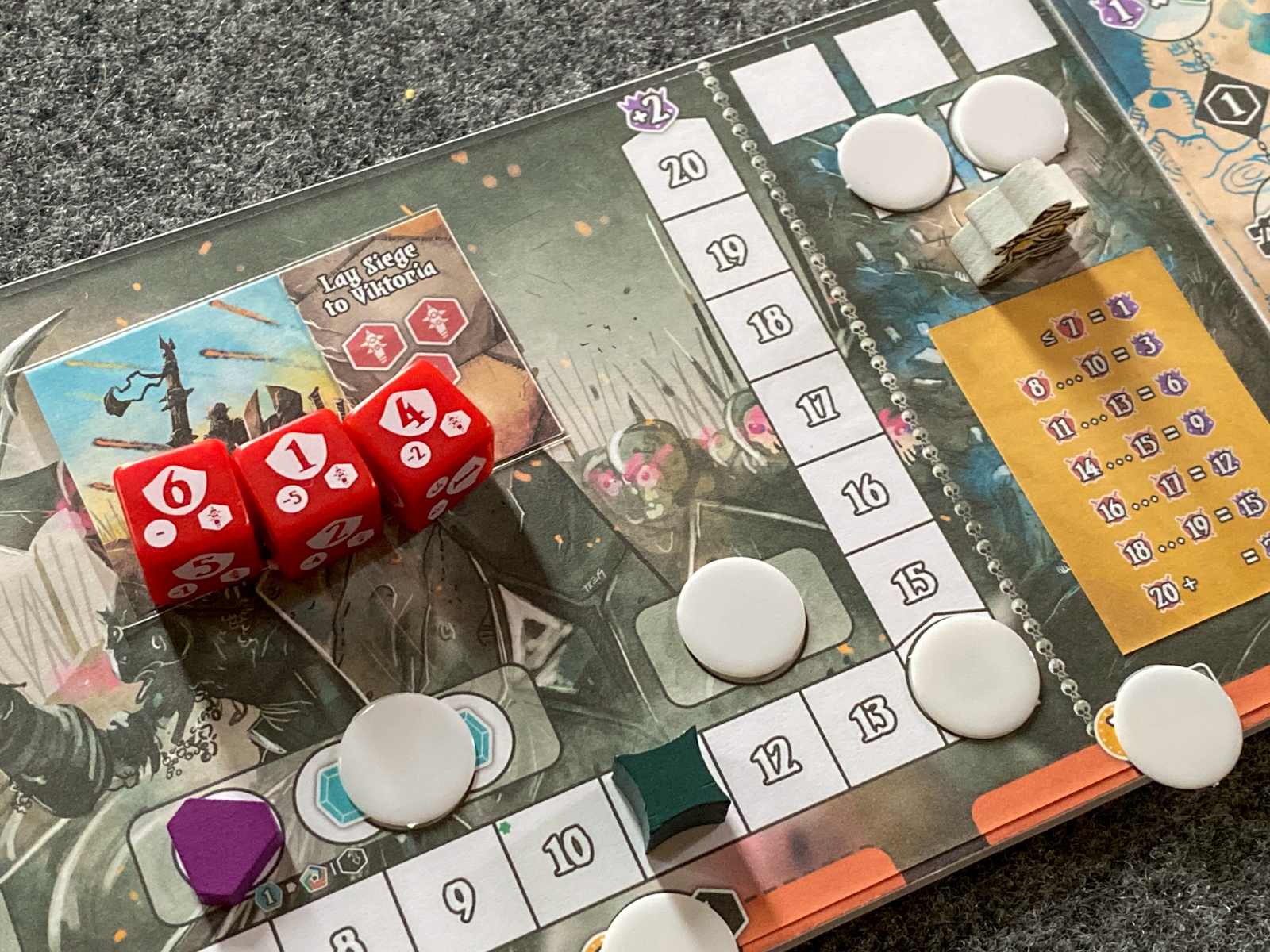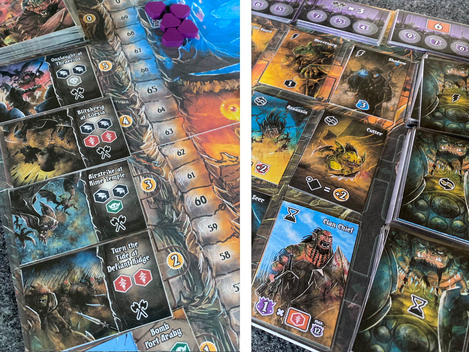 There is very little interaction between players, however, despite the theme. There are battles, but they are an abstract represented by the name and image on a battle plan card, and the only variable in the outcome is how many victory points you accrue. Instead of fighting each other, players are vying for the title of general. You might end up thwarting an opponent’s plan by grabbing a card or a resource they were after, but there are so many options available to fall back on the impact is minimal. Ultimately it comes down to the final point tally once that seventh skirmish area is filled, and close grouping on the victory track can lead to an exhilarating outcome once end-game bonuses are calculated.