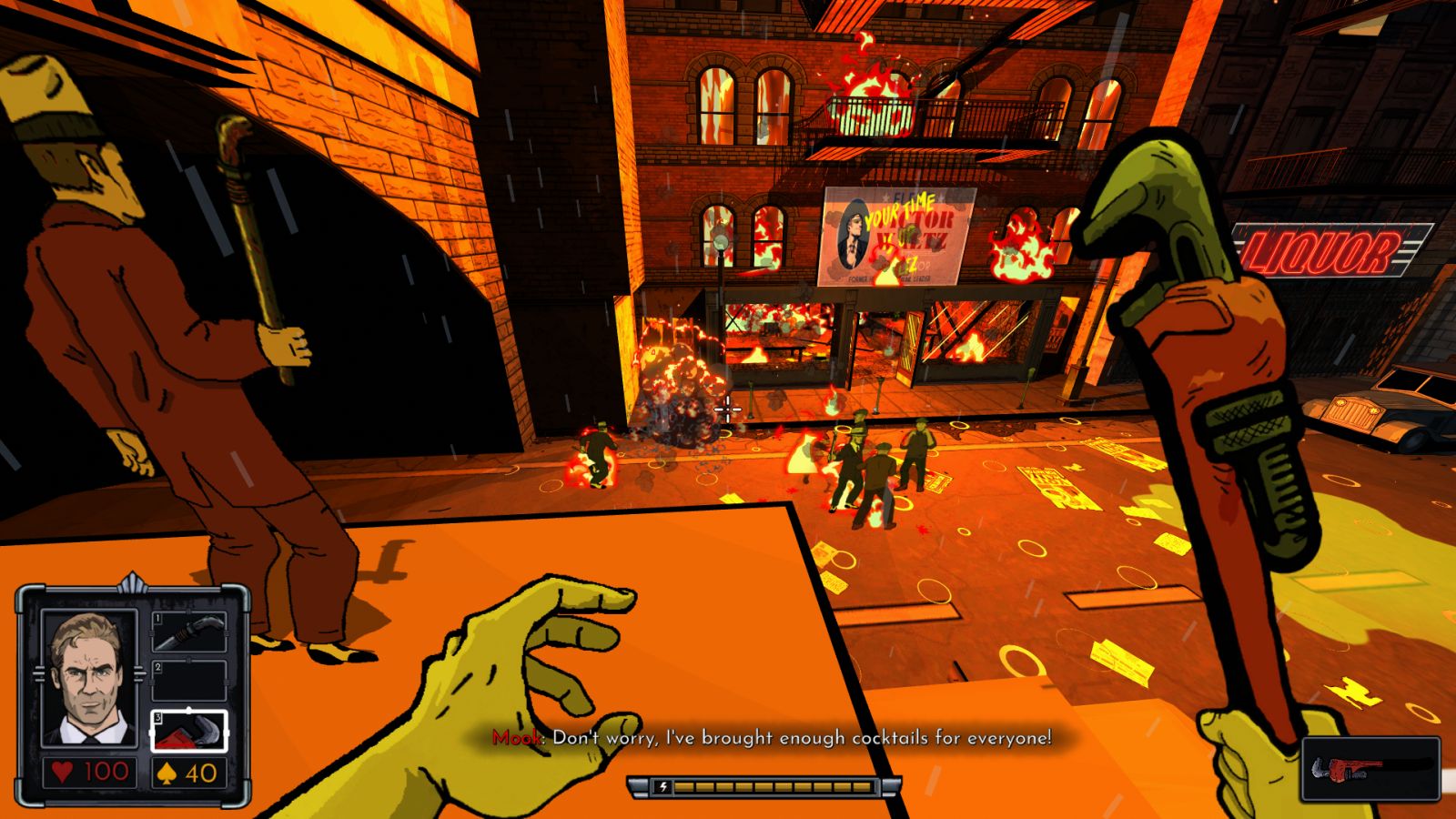 My first run in with Fallen Aces was back during PAX East when the New Blood Interactive booth caught my eye with its Art Deco aesthetic and pulled me in. There I saw a few men walking around in nice suits wielding baseball bats, one of whom was Trey Powell, one the game’s two developers. I got to sit down and play a little, and I rapidly became engrossed by the open level design, brutal street fights, and intriguing plot, but I was torn away by other obligations before I could get more than a few notes down. Still, that little bit I played left a lasting impression on me, so I wanted to play through the rest of the early access game to see what’s up.