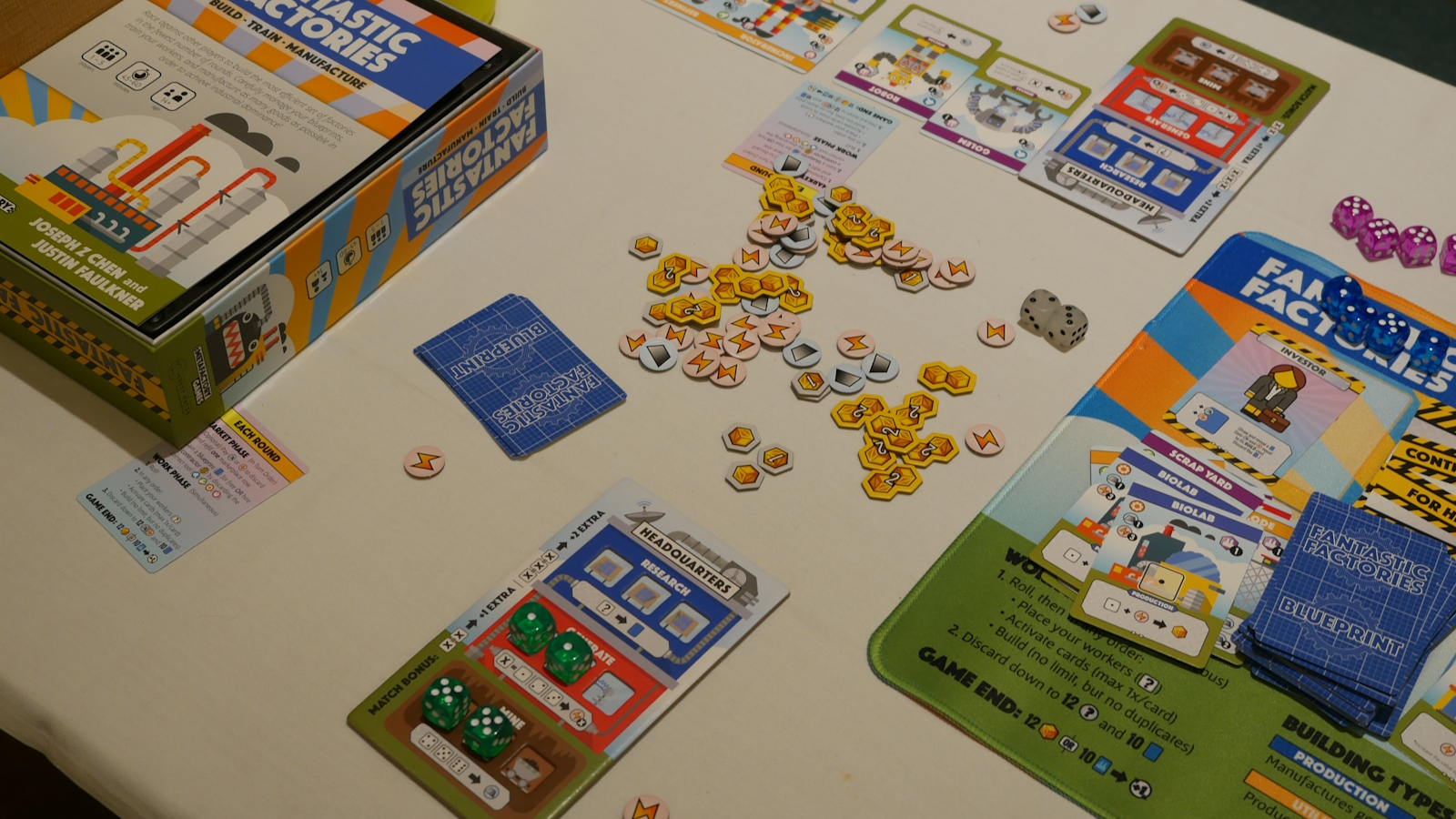Fantastic Factories is a light tableau building card game with dice. Players first have a market phase, where they get to draft a card. Then, all players can simultaneously roll their dice and run their factory. Whoever can build and run the best factory will win by collecting the most points.