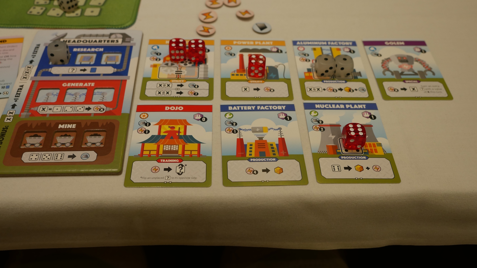 You can activate each card in your tableau once per turn. Many of them require dice of specific values to activate. Others just require spending resources. Cards have abilities ranging from producing resources more efficiently than your headquarters to manipulating dice to producing goods. The two ways of getting victory points are producing goods and playing cards with prestige values.