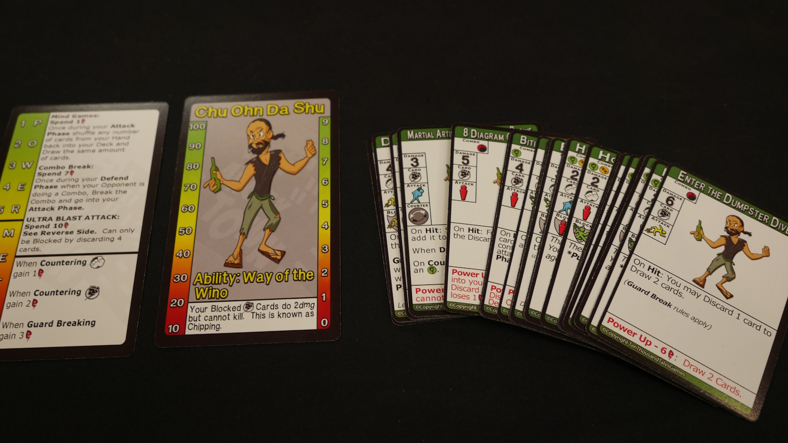 Each player starts with a unique character and deck of cards. Everyone has 100 health and a power meter that goes from one to ten. At the beginning of each round both players draw up to a hand of seven cards. The first player is chosen randomly at the start of the game and will alternate each round. On your turn you can play any number of cards, one at a time. Cards will have different attack types such as standing, low, jump, and throw and they will be normal or special attacks. Each card can also potentially block an attack of a specific type. After the active player plays a card their opponent decides if they want to play a card as defense. If they do not, the attack hits doing damage and potentially causes other effects as well.