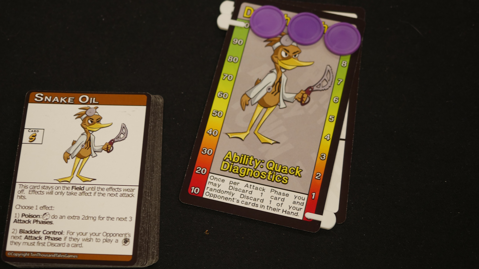 After the active player is finished playing all of the cards that they want they then pass and their opponent becomes the active player. Once both players have passed consecutively the round ends. Players continue to fight until one player has run out of health or cards in their deck. If a deck runs out the players play one more round and whoever has the most health left wins the match.
