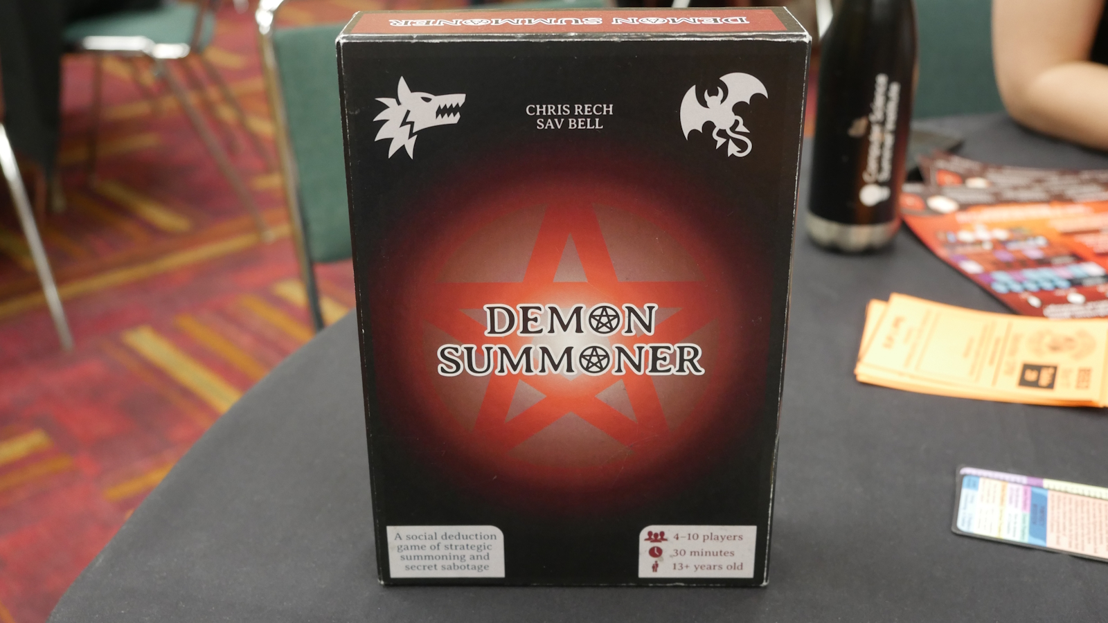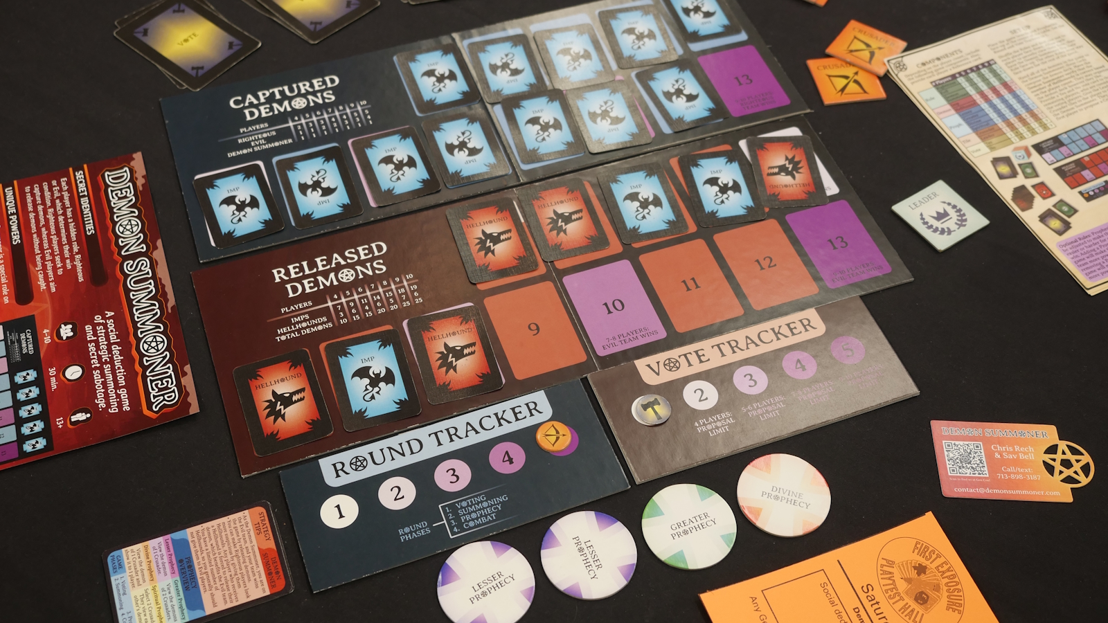 Demon Summoner is a social deduction game designed by Chris Rech and Sav Bell. The game is an evolution of existing social deduction games and takes many core mechanics from Avalon. Players are given hidden roles at the start with some being righteous and some being evil. Each round the player with the leader token will choose a number of players to go on a crusade and then everyone votes for or against that group. If the vote fails the leader token moves clockwise and the procedure is repeated. If there are too many fail votes then the final team is automatically successful. Each crusader will then receive a secret demon of which there are two types. Imps may either be captured or released, but Hellhounds must be released. Over the course of four crusades the evil team will win if at least half of the demons have been released while the righteous will win if more than half of the demons have been captured.