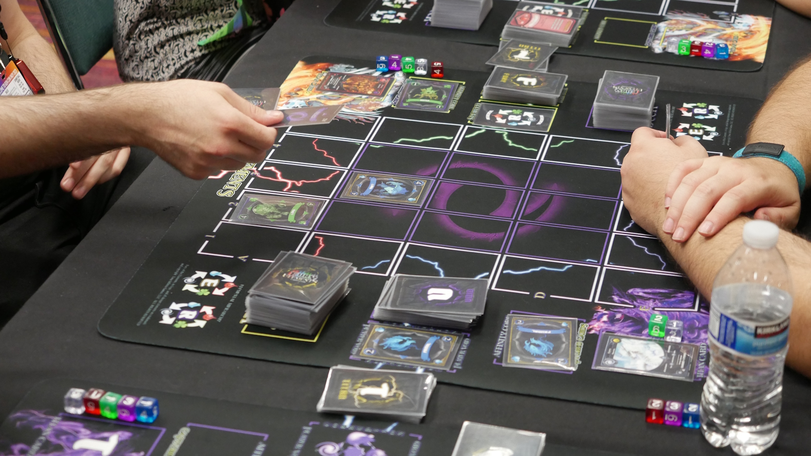 There is no capture when a clash happens, however it does two things. First, the hierarchy card flips to the other side. Second, a void gets opened on the board causing chaos. The void deck is 25 cards, one for each location, each also having a different number of arrows pointing in different directions. A clash causes one card to be drawn from the void deck. That void card is placed on the location indicated, sending any elemental cards underneath it to a special discard pile. Any cards pointed to by the void card are turned face down. These cards are now vulnerable to any attack from an opponent, but they can also be rescued by the owning player playing adjacent to them.