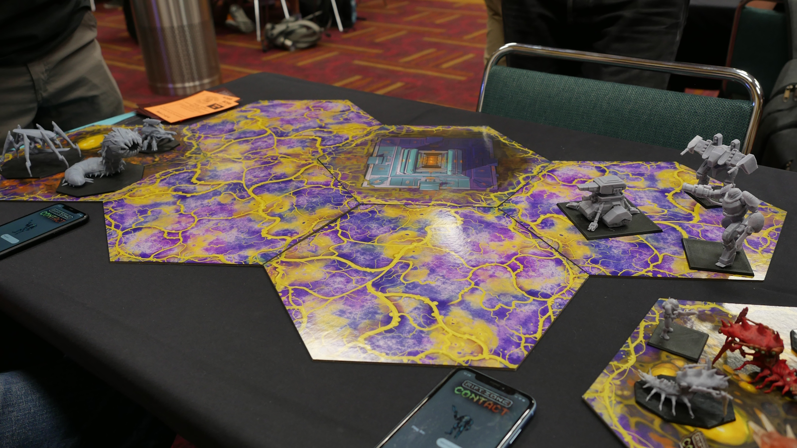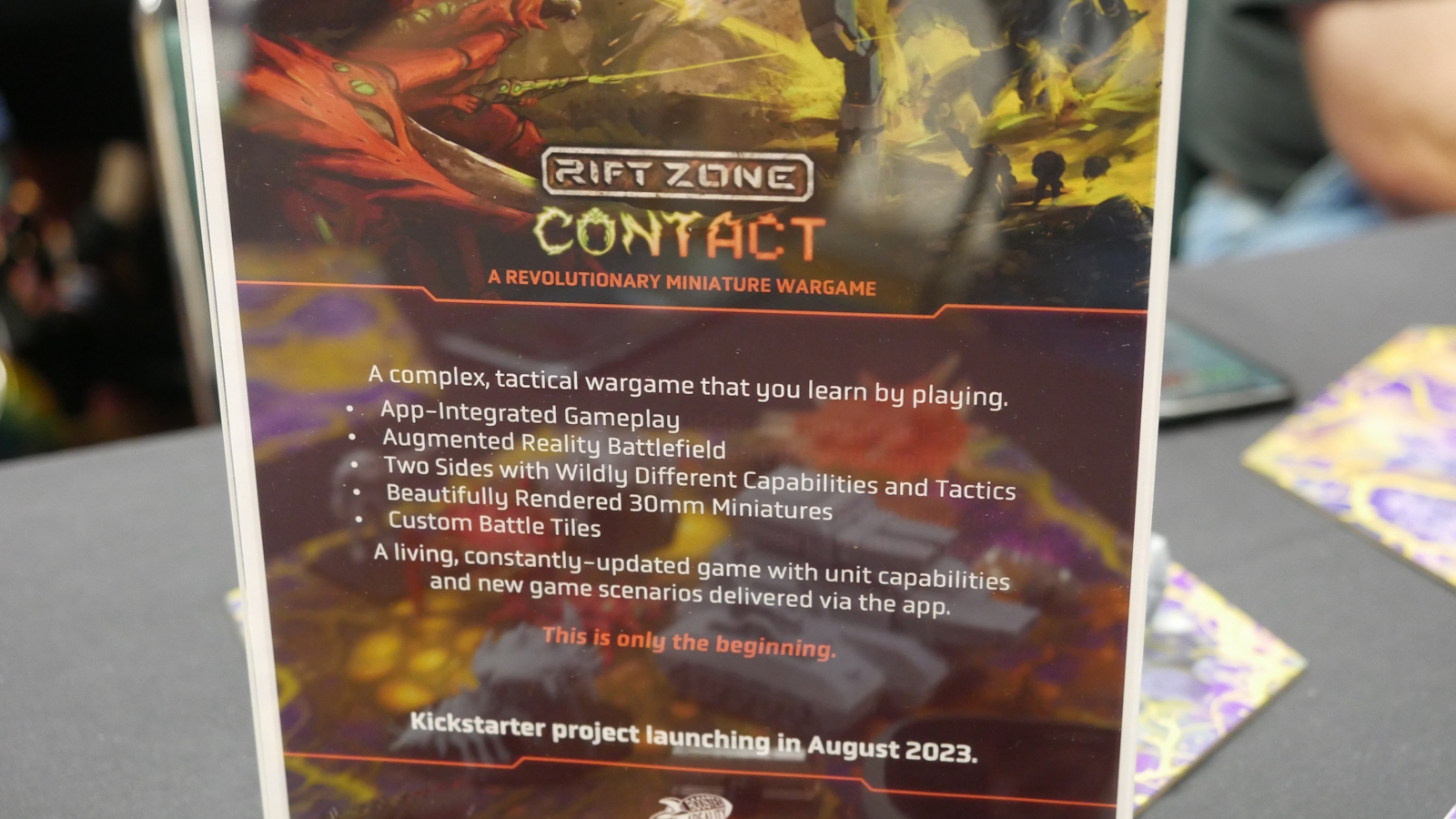 Rift Zone: Contact is a tabletop miniatures game controlled by an app using augmented reality (AR). The players each control a small force of units facing off in head to head combat. The demo games were 60 point armies composed of three models each. The models were 3d printed and quite large, each with a Radio Frequency Identification (RFID) tag inside for scanning with a phone. Each player uses their own phone running a dedicated app which contains all of the information on the units. Other than large hexagon board tiles and the models, no other game components were used.
