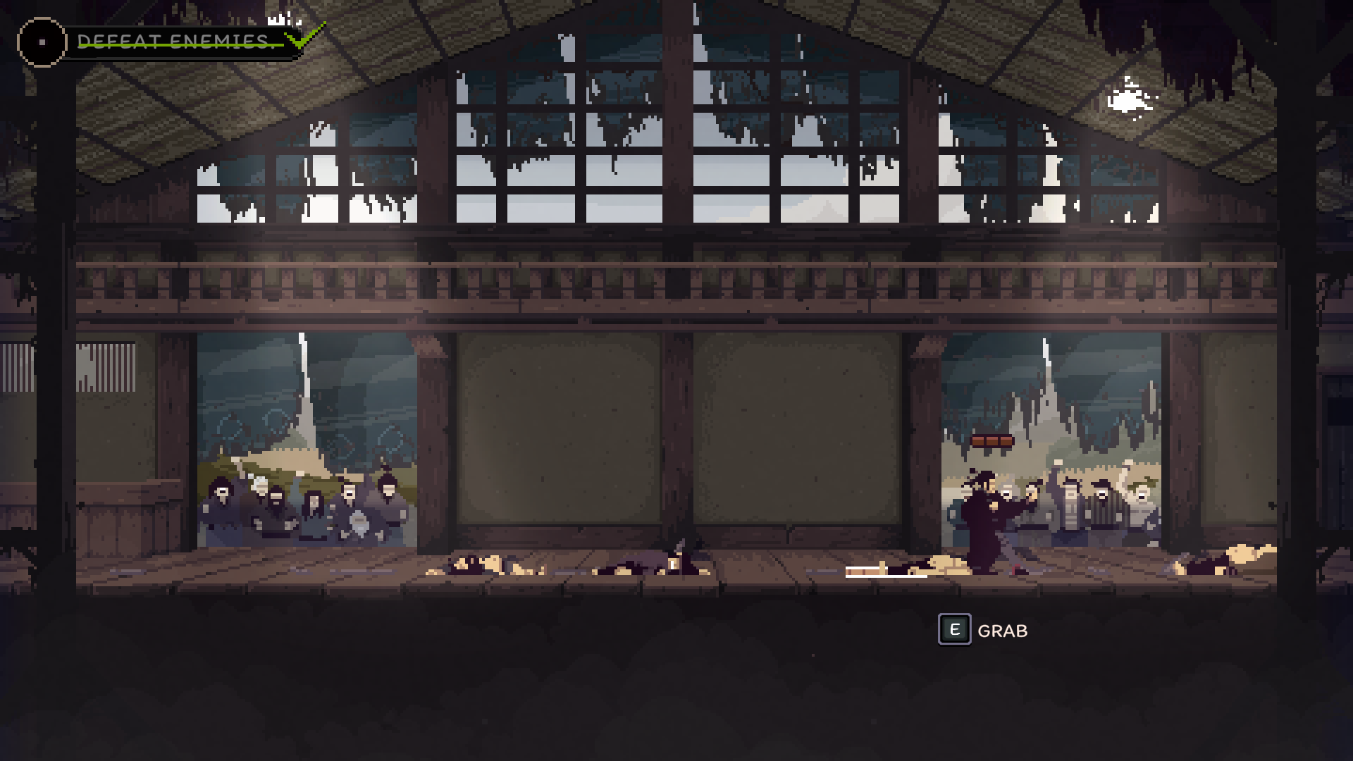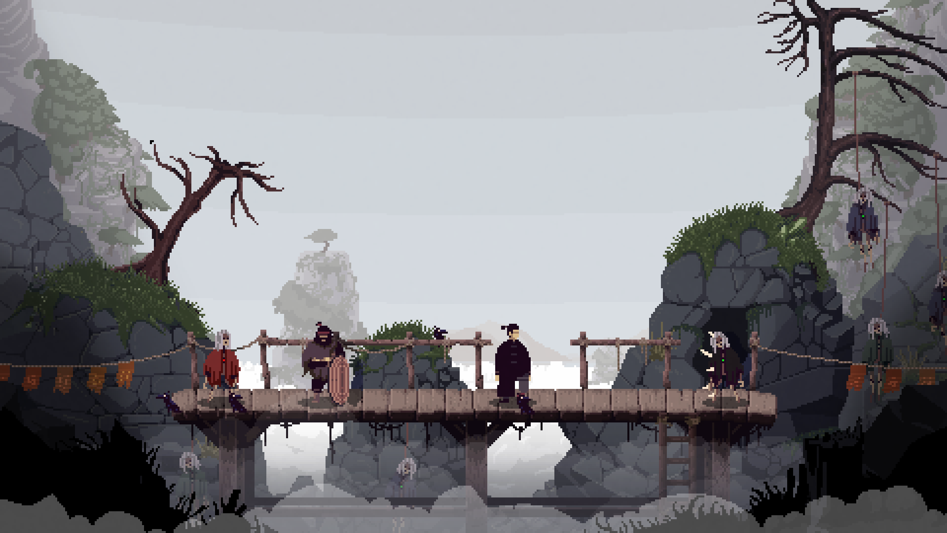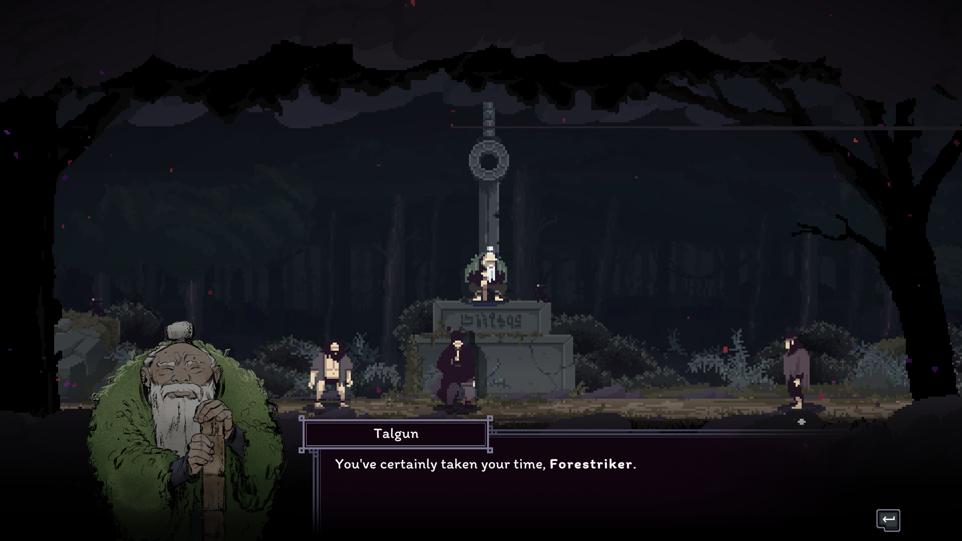 Forestrike’s pixelated art style is rich and varied. Progressing through the countryside zone felt like a treat for my eyes. The subdued hunter greens, oak browns, and slate greys of the environment help establish a natural tone. A more hand-drawn art style is an occasional treat used for character portraits, adding stylized detail to flesh out the models represented by stellar sprite work. The sound design is nothing to scoff at either. The sounds of punches landing and wooden furniture crashing down upon your opponent are violently satisfying, while the ambiance of wuthering dark storm clouds overhead and the calls of peepers and birds in the woods are relaxing.