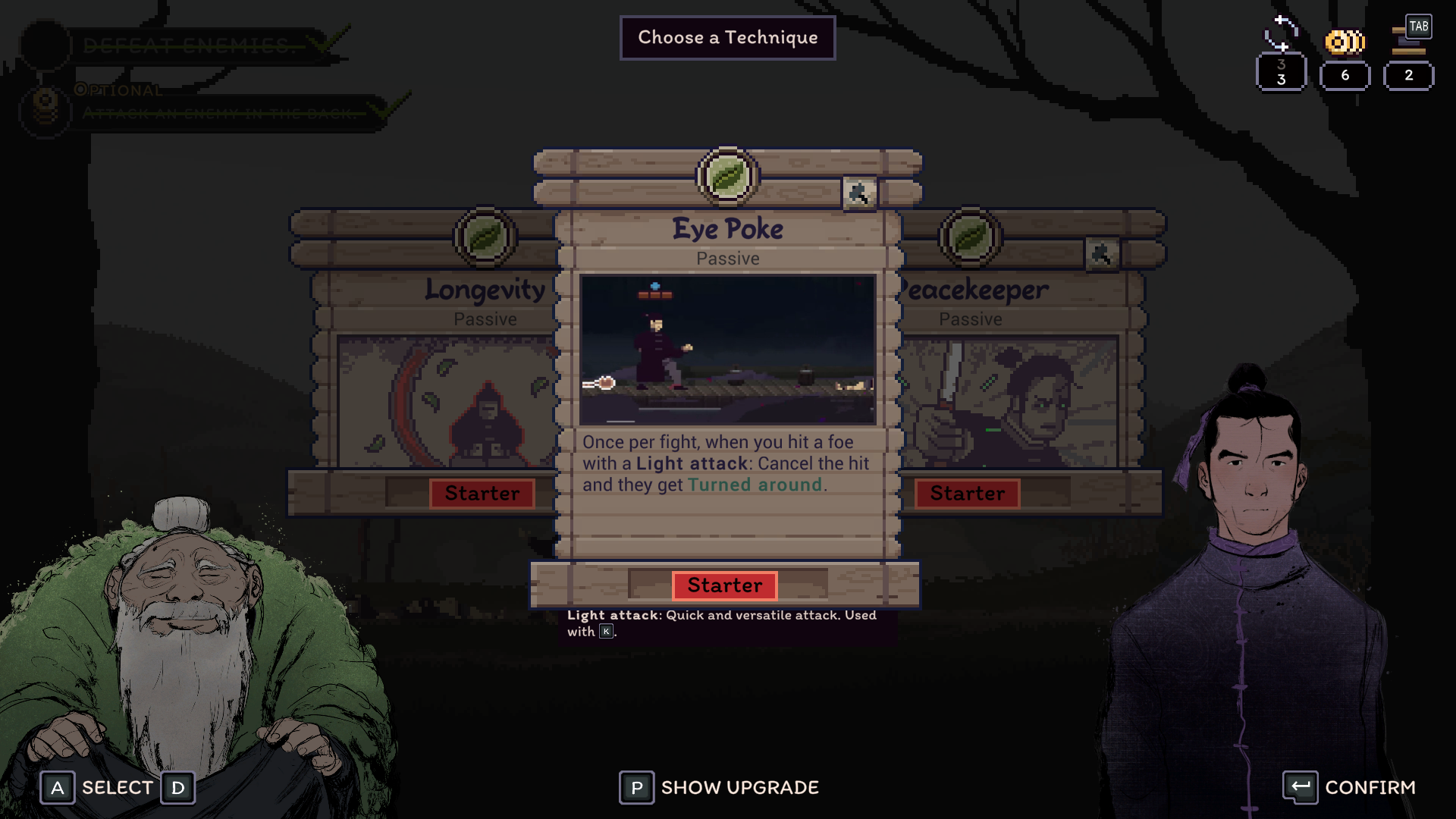 You can buy more techniques and upgrades for the ones you already have at shops, with coins that you gain at the end of every fight. Players have the option to complete side objectives to gain bonus coins. These are typically challenges like: win a fight without using a light attack, or win in 10 strikes. So, on top of the initial desire to conserve health, one might master a particular fight to gain bonus coins as well.