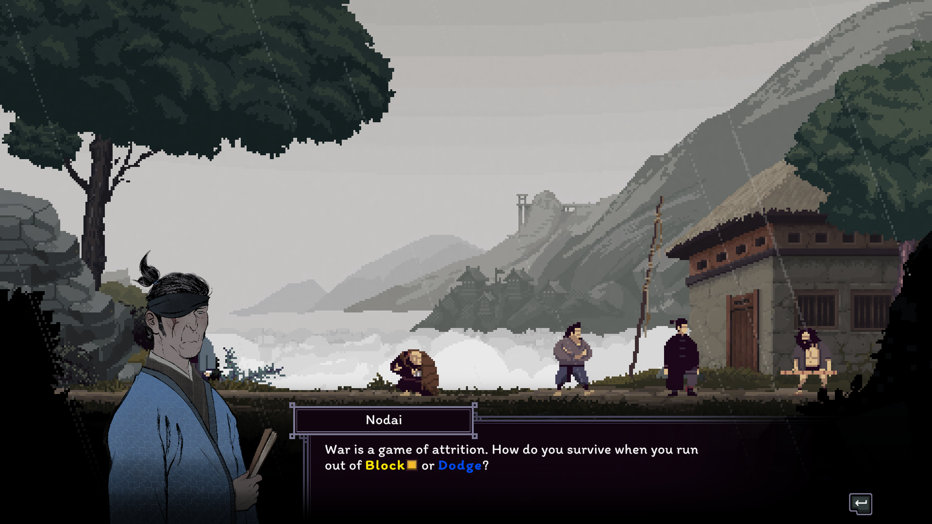 Players will eventually meet one of the masters of the Order of the Foresight, Talgun, who appears to guide you through a battle. Talgun is a stout old man with white hair, a long beard, and cloaked in a green, moss-like robe. His fighting technique, the peaceful Leaf style, is the one you start with, and it emphasizes evasion and using your opponent's attacks against them. There are currently only two masters in the game, the aforementioned Master Talgun with his Leaf style, and Master Nodai with his Cold Eye style. The latter is a tall, stern-faced man in a blue robe, with a headband covering his right eye. He visually fits the description of the combat style he teaches, with a personality to match. The Cold Eye style emphasizes taking hits like a tree trunk and dishing them back out like a truck, with blocks and retaliatory strikes being the name of the game. This style also turns your kick into a move where you throw your opponents into the air. There will eventually be five fighting styles, so we can count on three more masters making an appearance.