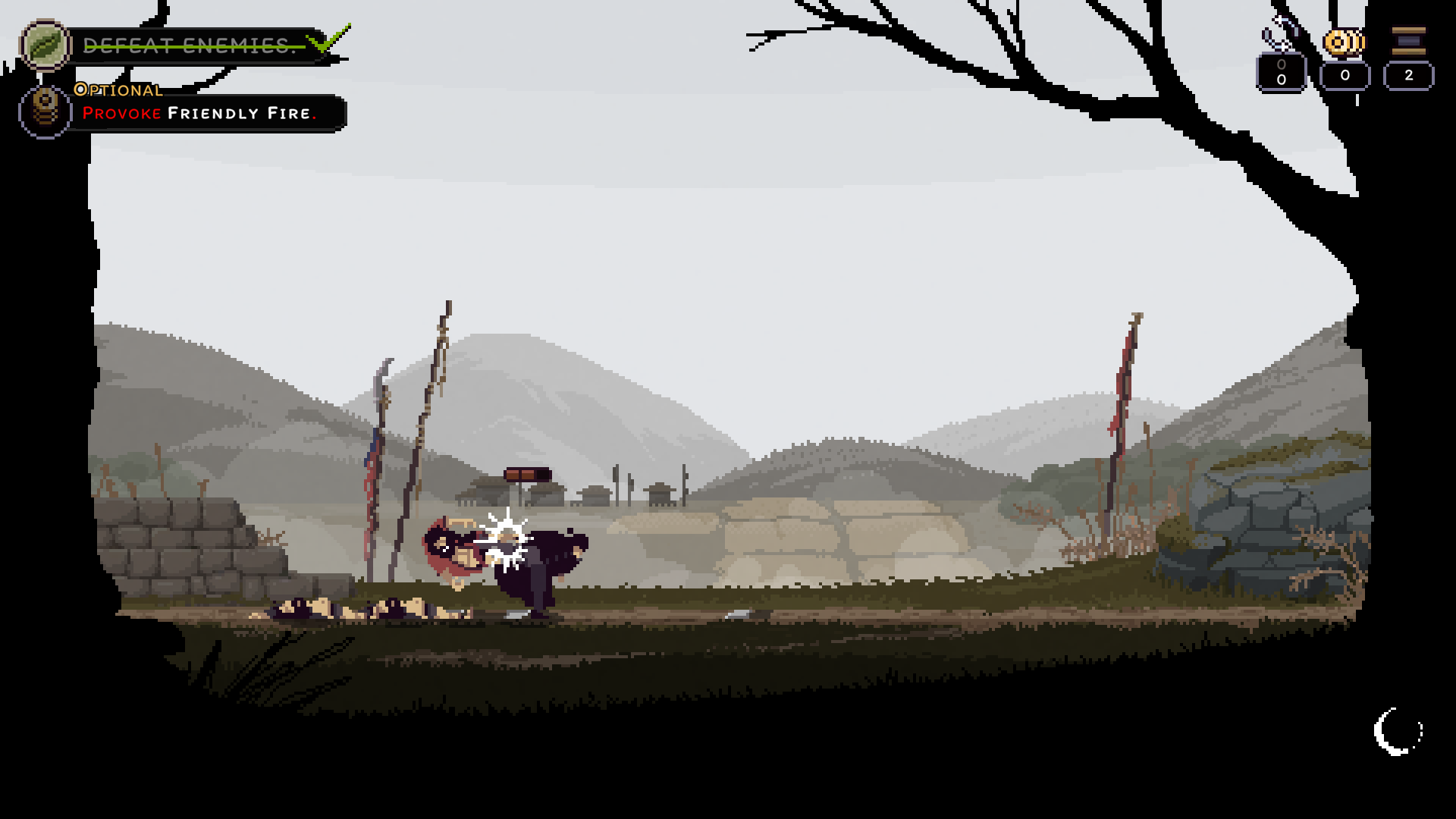 Hopping into the gameplay, you start in The Countryside, the first of 4 zones, which you’ll fight through in stages. You’ll soon find yourself flanked by drunks, who have been sent to hinder your mission. This is where your special powers come in. Players can activate the Foresight to rehearse a fight as many times as they’d like before starting the real battle. In combat itself, use light attacks to dish out a quick jab and heavy kicks when you find a longer opening to deal out more substantial blows. Dodges allow you to avoid attacks if you have a charge remaining, possibly causing enemies to friendly fire. If an enemy has a dodge, you can trick them into dodging into their allies' punch. Blocking opens up recovering enemies to a swift counterattack. You can block if you have a block charge or if you’re holding an object like a table or broomstick, which will break upon use. Alternatively, just throw the object at the enemy to deal damage at range, disarm their block, or trigger their dodge. As you can see, there are many ways to outplay opponents, and just as many ways to outplay yourself. Remember, the Foresight is just a practice tool, so any minor tweak to the rehearsed battle can butterfly effect you into unknown territory. With uncertainty comes imperfection, and with imperfection comes attrition of your resources, leading to your defeat.