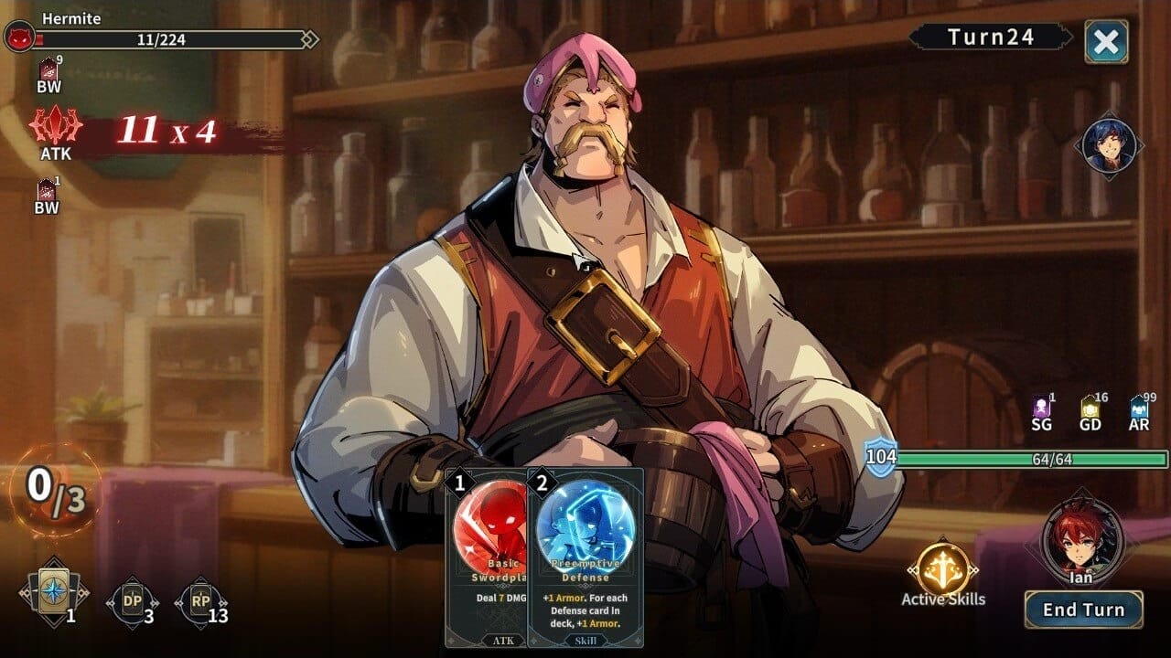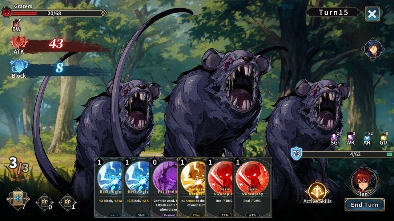 Once a skirmish is initiated, either by landing on a battle space or reaching the destination in the movement phase, the player will fight in turn-based battles using a card system. Each turn has six cards randomly drawn from the deck, and the player can play any card as long as the sum of their action values do not exceed the amount of action points the player has. The early battles start straightforward enough, with cards that deal a small amount of damage to the enemy, or defensive cards that give the party Block points which function as temporary HP. However, the battle system begins to show potential once the player can get their hands on more cards.