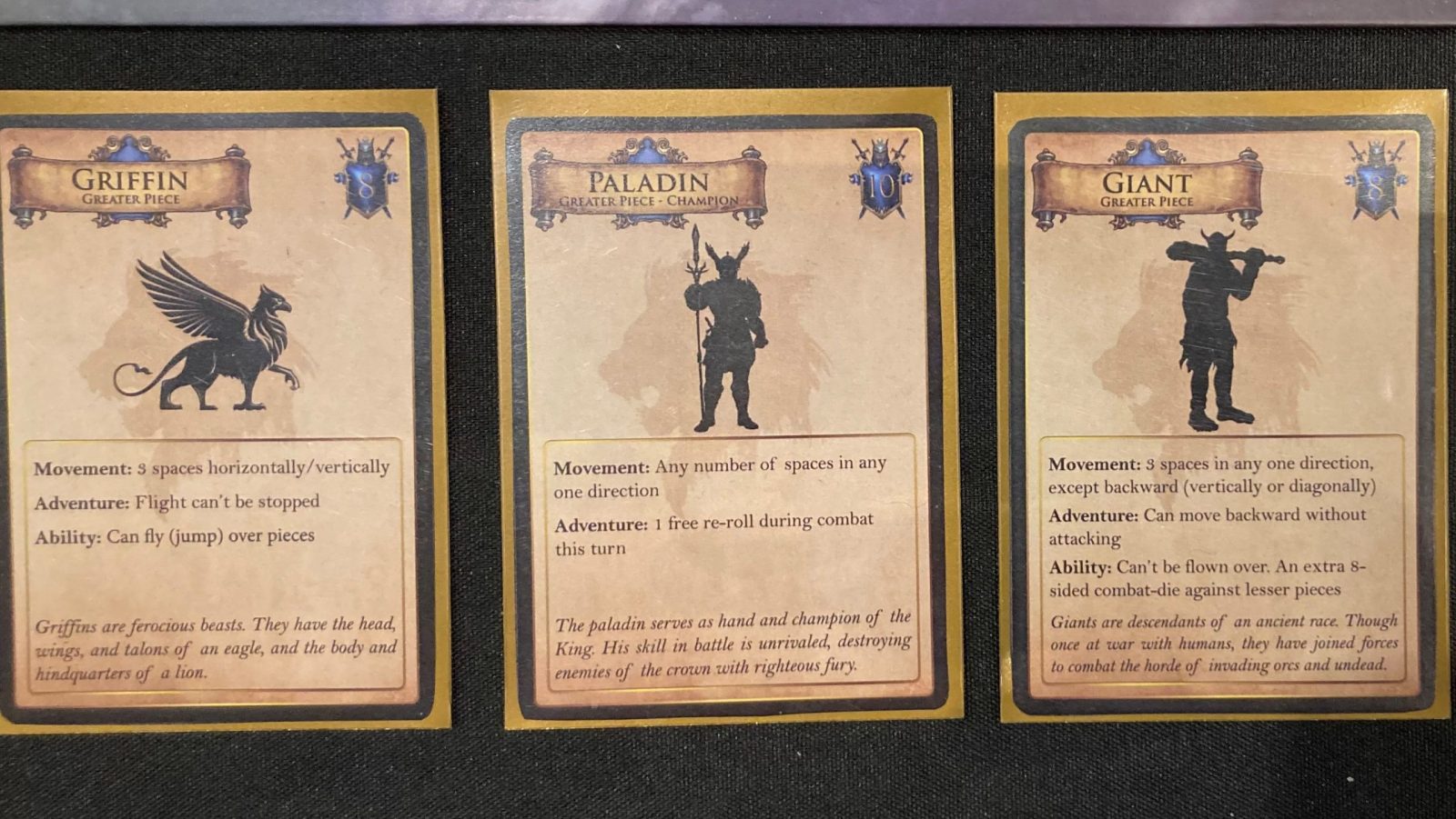 The players’ pieces also continue with this struggle between good and evil. While the sides are correctly balanced, the cards for the pieces depict their opposing sides. The dark side has skeletons and orcs while the light side has soldiers and elves. The light side has knights and lions while the dark side has death knights and dire wolves. Finally, the dark side has dragons, ogres, and a lich while the light side has griffins, giants, and a paladin. Each corresponding piece (soldier/skeleton and so on) has the same moveset, so it never feels unbalanced. It’s simply flavoring, but it fits thematically.