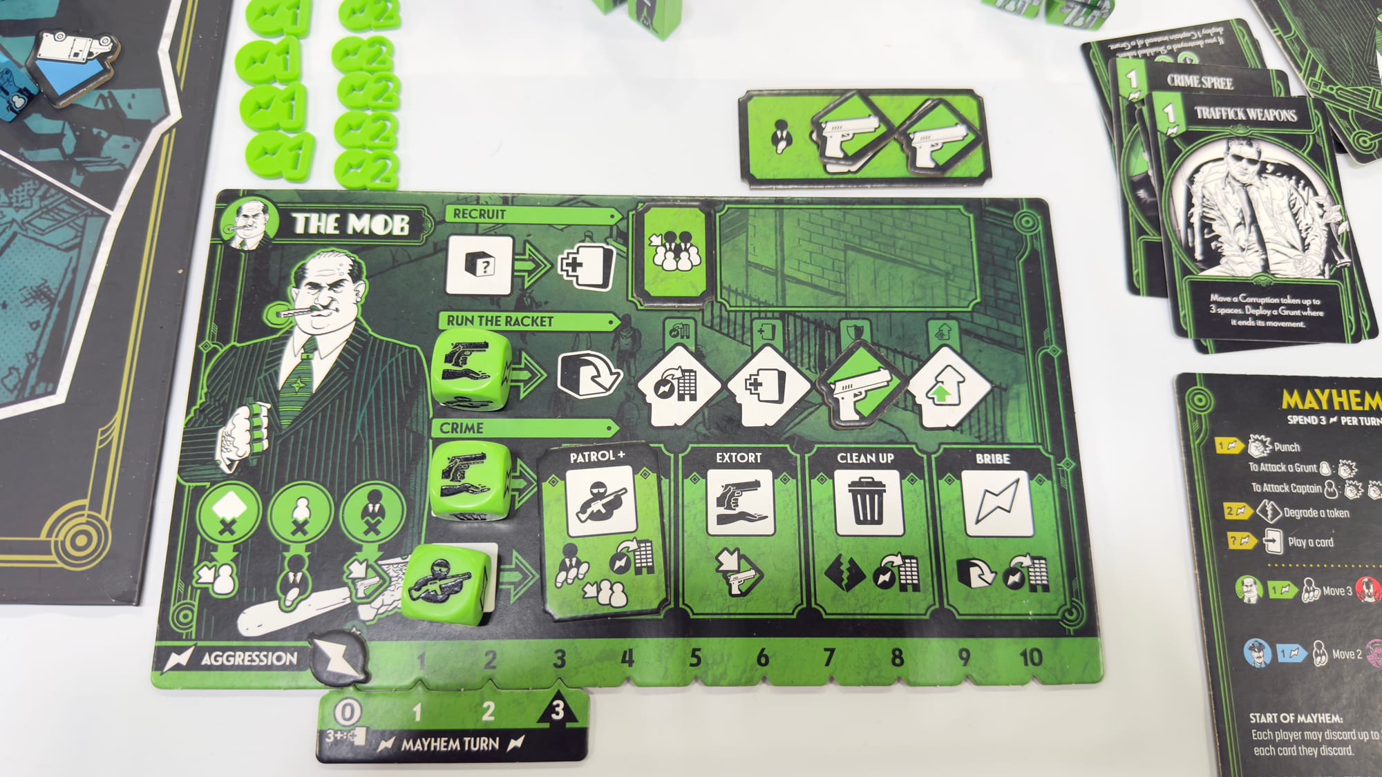 The four player faction boards of the base game: The Mob/Green, The Police/Blue, Argent/Purple, Grendel/Red.