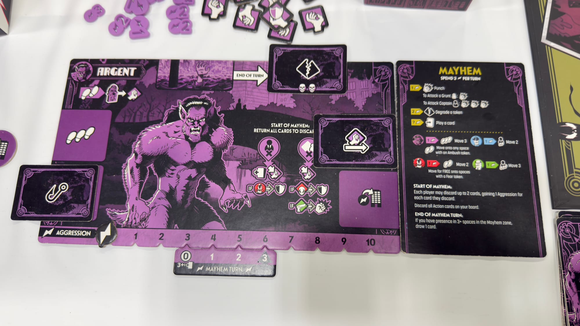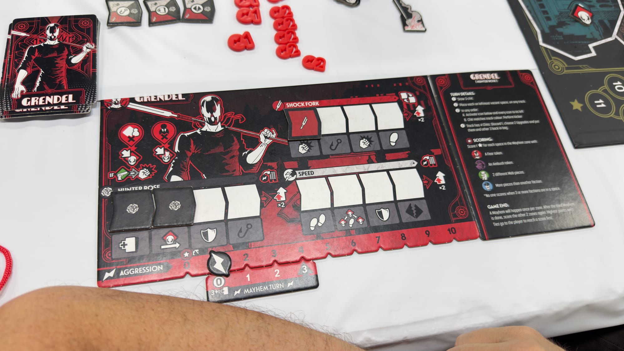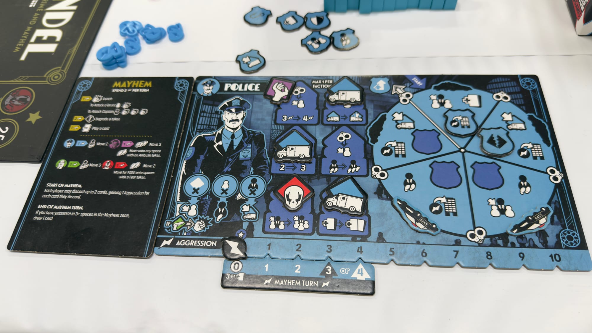 We got to sit down and play a few rounds of the game at Origins this year, and came away pleasantly surprised at how quickly we were able to get up to speed with the different player factions: The Mob rolls and allocates dice, The Police travel around a rondel on their player board, Argent uses a deck of cards, and Grendel spends the game bag building. Each of them has their own method of building and gaining control over the three different regions of the city depicted on the game board, as they upgrade their unique abilities and progress towards their faction’s win condition. Each region of the city has a corresponding tower which players feed Aggression tokens into, eventually triggering the physical counterweight ‘collapsing’ the tower and unleashing the mayhem phase on the region, and that’s when the fighting begins! On the third mayhem phase, the player with the most territory or scored end game conditions wins the game!