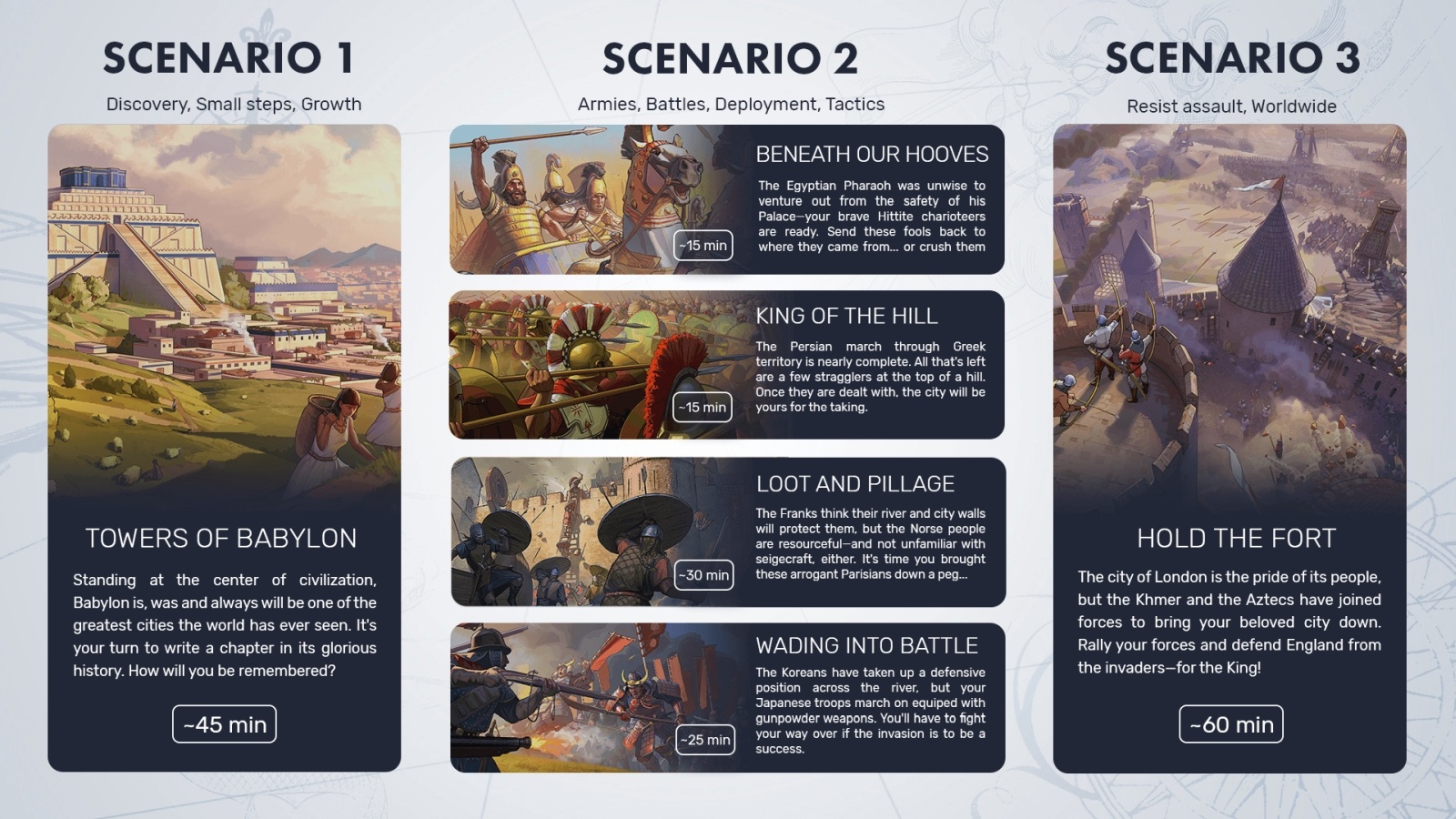 You can watch the entire Babylon scenario in the video above, and get a good laugh as I fumble my way through trying to figure out how the game works. I’d say I started to get the hang of things about thirty minutes in. By the time the scenario ended at just over an hour of game-play, I was just getting into the swing of things and wanted more. I built some food and workshop buildings in Babylon, but my main focus was taking my Scouts out to look for new places to conquer. As I explored, wild animals such as deer and mammoths started to roam near me on the map. Spoiler alert, I got trampled by a LOT of mammoths! But once I got some more complex research done, I was able to build stronger military units to take on the mammoths, and just when things got really fun, the scenario ended.