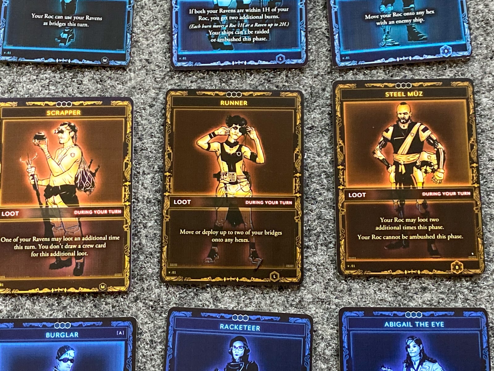 Both Rocs and Ravens can visit “Dive Bars”, Green hexes with a green Dive chip. You don’t get to keep the chip, but you can draw up to a full hand of seven crew cards, or discard what you have and draw a complete fresh hand. Each crew deck has a theme and unique gameplay style: The Isan (yellow) are all about speed and distance during the loot phase, while the Conclave (purple) can trump other bets and even manipulate the cards on the tableau.
