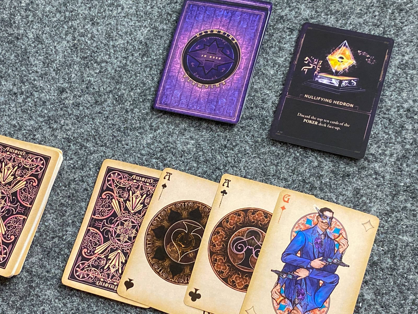 Another key addition is the Grifter card. Grifters are described as Antematter’s Joker cards, but instead of leaving them out of the deck, they can end up in a hand or on the table, and where they land determines the consequences. When a player is dealt a Grifter, they can choose to either replace it with a new card or hold onto it. If they keep the Grifter and are able to bluff everyone out of the hand they get a massive payout of 20x the current ante value. A Grifter hand cannot win in a showdown, however, even if the player’s other pocket card would ordinarily result in a win. Anytime a Grifter card is dealt to the board, it is removed to the burn pile and a replacement is drawn. If it happens to come out on the flop, then an Enigmata card is drawn. This small deck of cards has only one specific purpose- to dramatically change the rules of the hand. Some examples include reversing the order of play/betting around the table, dealing a second flop that the players can choose to use instead of the first one, or forcing each player to choose one of their pocket cards and hand it to the player on their left. Enigmata cards can swing a hand in just about any direction, and the deck introduces the biggest changes to the standard Hold’em rules.