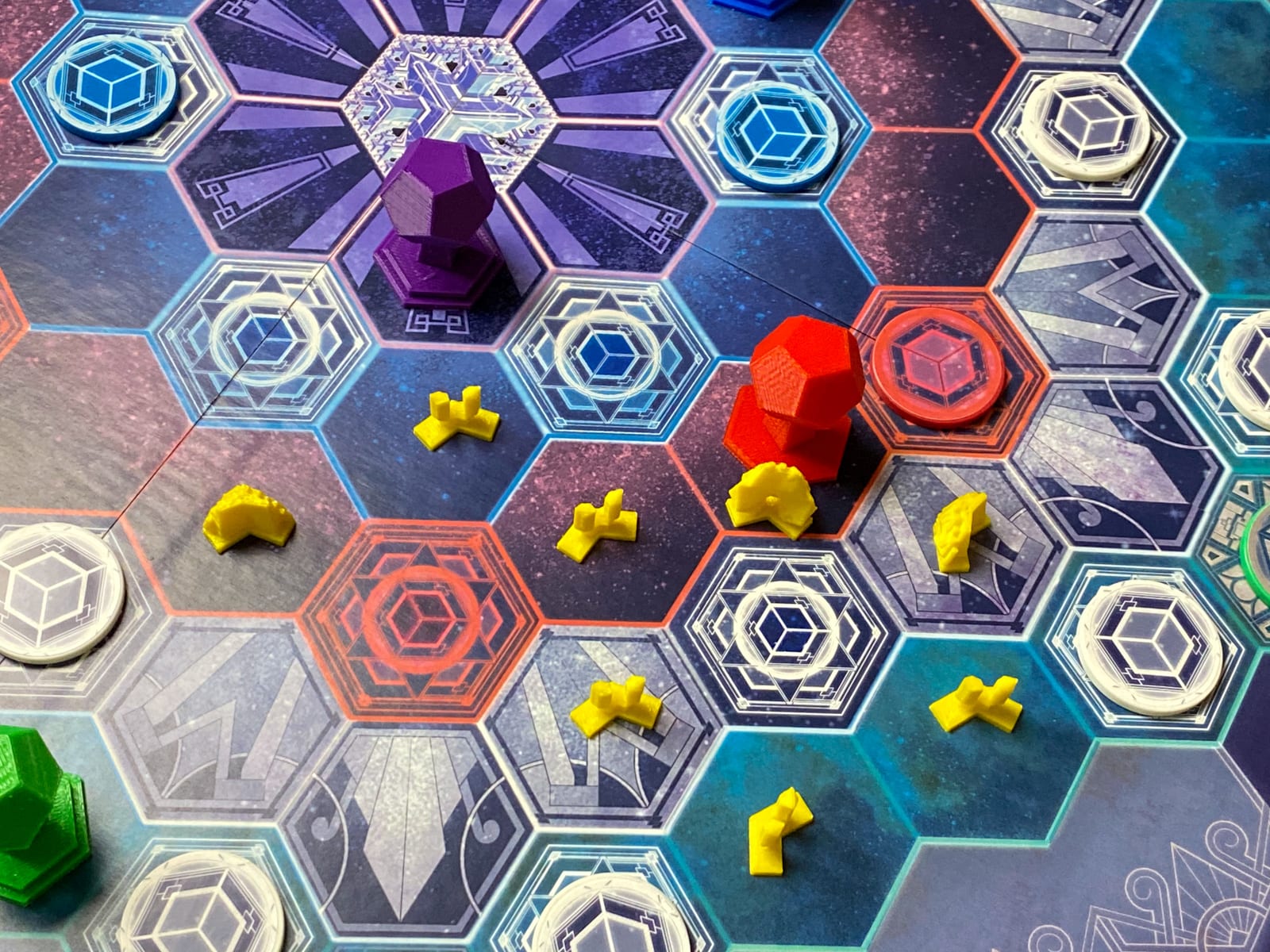During the “loot phase” of each cycle, players take turns piloting their ships around the map, looting “Plunder hexes” and planets for chips and more. Each player gets three “burns” on their turn. Ravens can move two hexes on one burn, and can plunder the white, red, and blue plunder hexes for Nephelium of the corresponding color and value, also drawing a new card from their crew deck to be added to their hand once they complete their turn. Rocs, however, can only move one hex per burn under normal circumstances. They cannot loot the Nephelium on plunder hexes, but they can land on planets and loot them for two Nephelium of the corresponding color (when applicable) and a matching cargo cube. Cargo cubes can be traded for 100 Nephelium each at the center hex, known as the Engine Star. Each player’s Roc can only carry one cargo of each color, and if a complete set is traded in at the Engine Star a bonus 250 Nephelium is awarded.