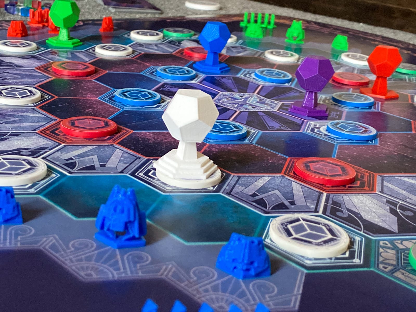 Even in prototype form, the visual design of the game stands out, blending Art Deco, Steampunk and science fiction. The board alone is a beautiful sight on the table, though I would like to see a little more utility added- a tracker for cycles and stages for instance would be very helpful, or even a chart that displays the winning thresholds by player count. Having more prominent visual cues for these mechanics might help enforce them better during the game. All in all, I’d guess the prototype is very close to what the final product will look like, and I’m eager to see how improved build quality and printing enhances the beautiful artwork on the various components.