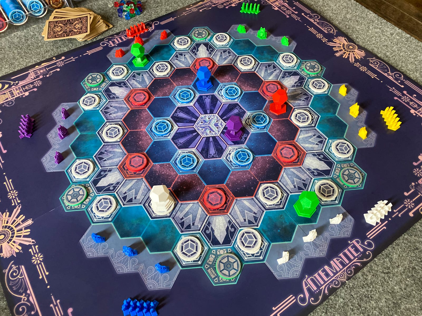 We had a lot of fun with this game! I’m a big fan of Hold ‘em, and Antematter deftly scaffolds a sci-fi strategy game on top of the familiar gameplay. The loot phase provides an interesting way to build a chip stack up to fuel more daring strategies during the poker phase, and the give and take of it becomes even more hectic and interesting the more players you have, as loot is more scarce and ambushes are more prevalent. I especially liked formulating strategies around bridge placement, surprising opponents with unpredictable board traversals and snapping up chips right under their noses. It’s nice having a set of game mechanics I’m familiar with out of the gate, but that is a double-edged sword- those same mechanics I’m counting on are easily subverted by crew abilities or enigmata cards. I had a blast with these added rules, but I would like to see how playing more than one hand impacts the game overall, as I feel playing only one hand blunts the experience a bit. It’s harder to get a read on your opponents and I’d love to spend more time with the rule-bending Enigmata and crew cards. The most exciting parts of the game happen during the poker hands, and I want more!