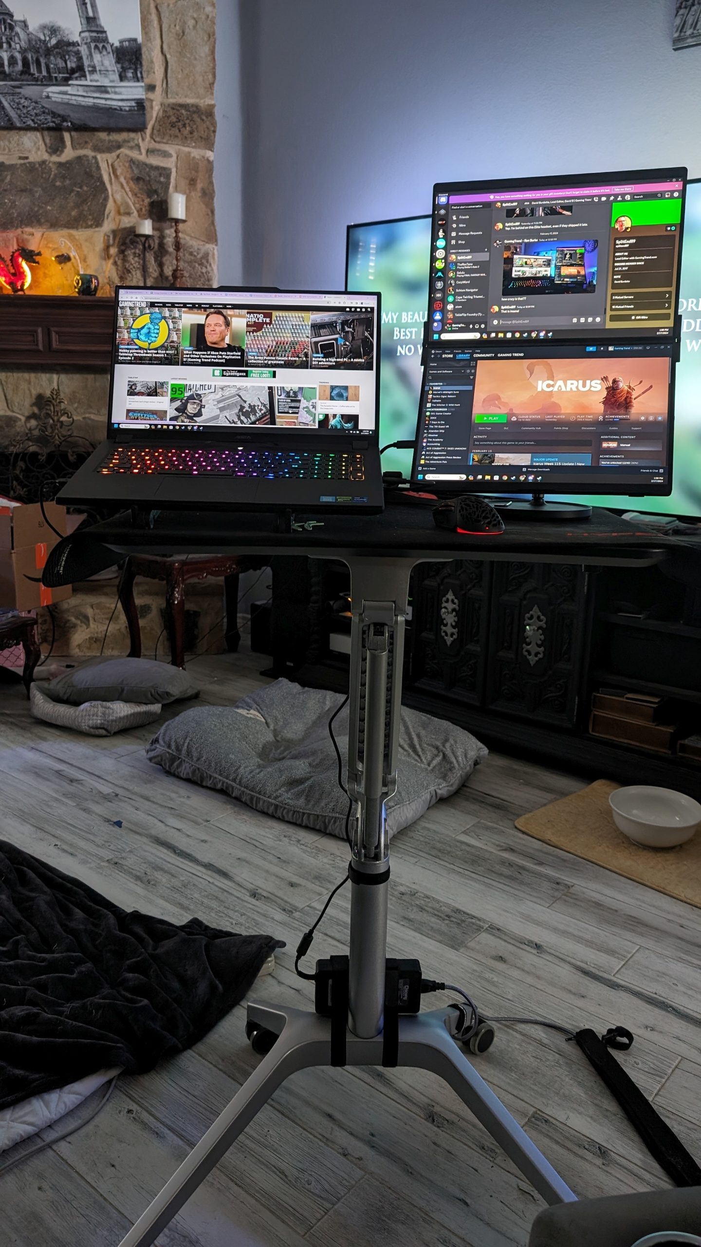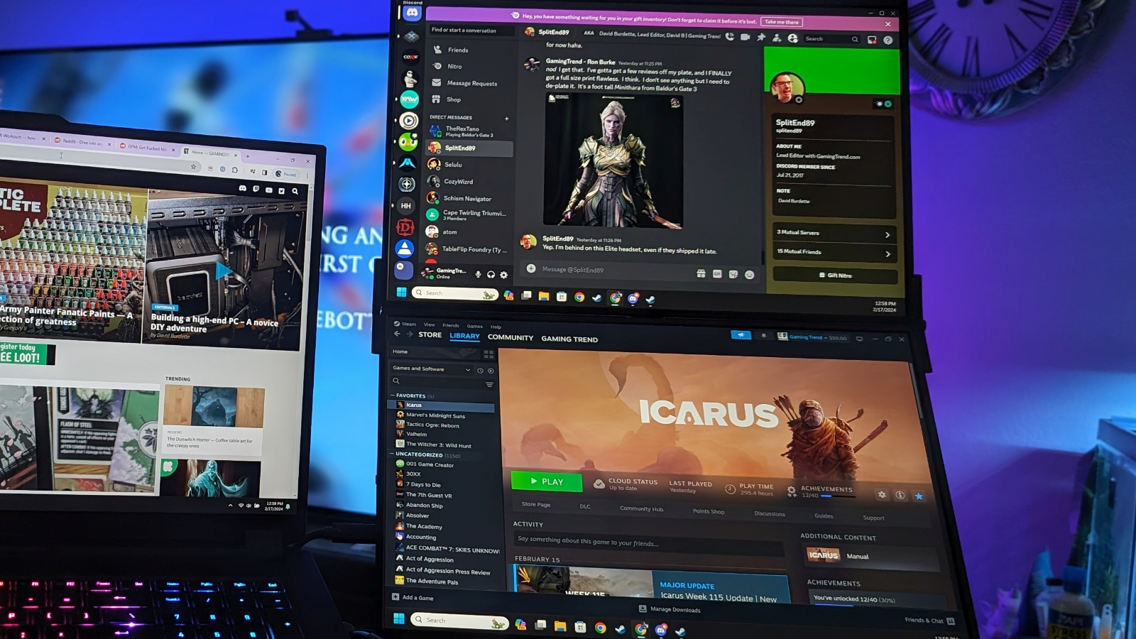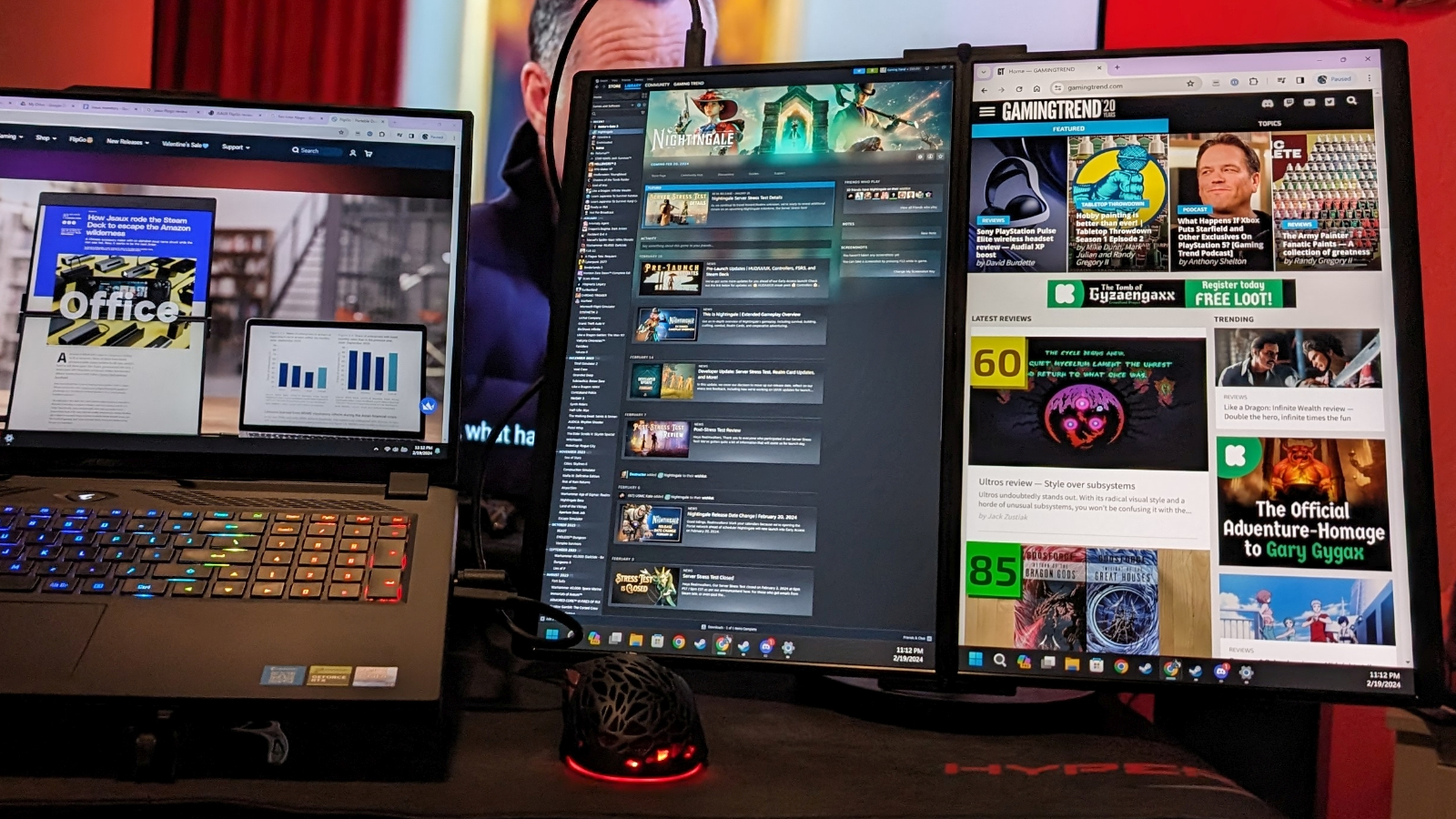 The monitors are 2.5K, which is to say 2560×1600 resolution and a 16:10 aspect ratio. It’s an IPS panel with a 178 degree viewing angle, which is frankly better than a lot of full size monitors. It has 100% sRGB color coverage, and it shows – these monitors are gorgeous. The 60Hz refresh rates are going to cap your in-game refresh rate, but that’s hardly holding you back. More likely you’ll be gaming on your monitor’s screen and running OBS, keeping your mail open, or whatever else on the other two anyway. The brightness is 500 nits, which is at the top end of what you’d expect on a laptop and frankly unheard of in a secondary portable monitor – those are normally 350 nits. Higher nit values allow you to use the monitor in brighter environments, and that becomes more important as the angle of your monitor increases. Given that this device can be oriented several ways, creating a multitude of angles, it becomes downright crucial.