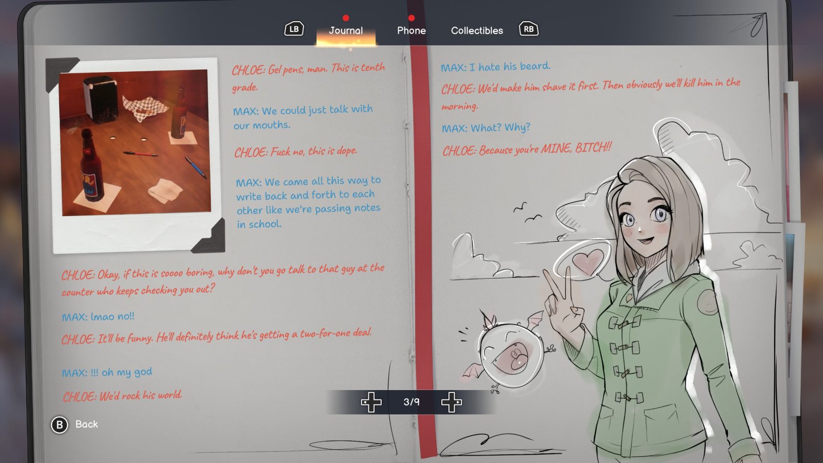 As shown in Double Exposure’s reveal livestream, there is a choice early on that dictates what ending the player chose at the end of the first Life Is Strange, and that choice will dictate the contents of Max’s text messages, and the notes in her journal, all of which is updated through the course of the game and can be brought up at any time in the press of a button.