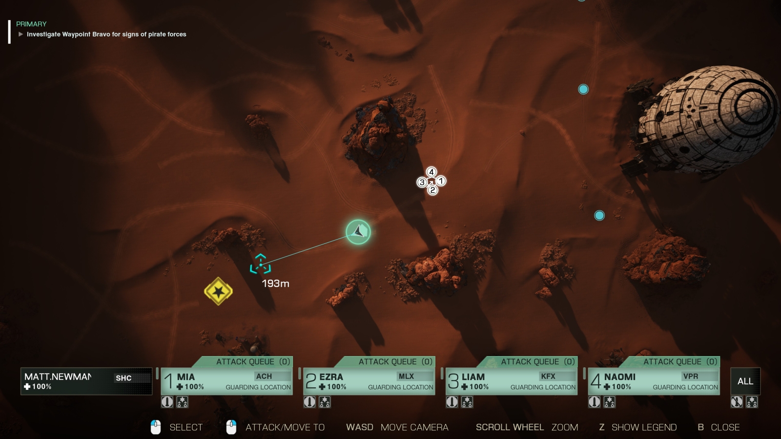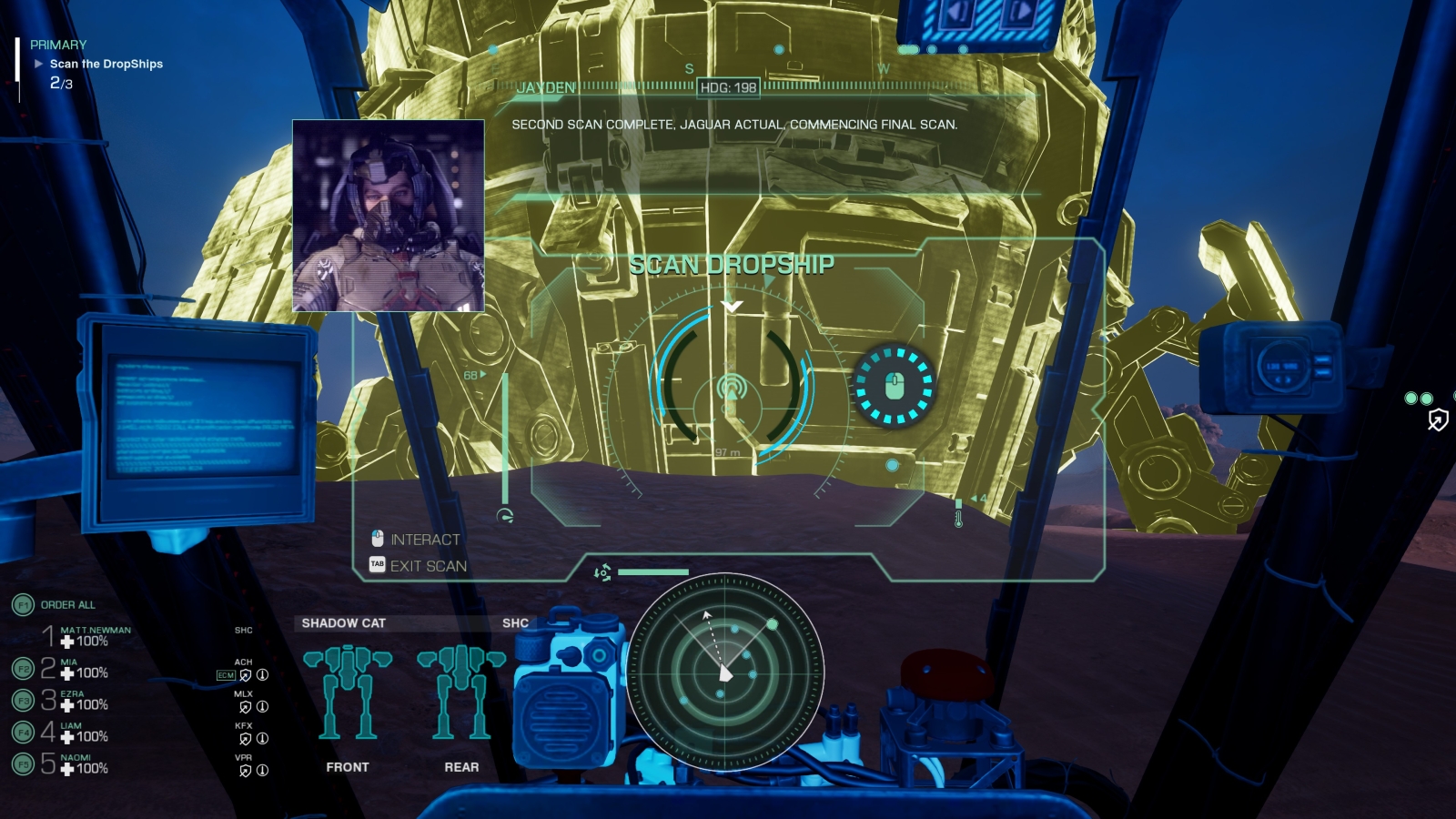 Russ hits a button and we get our first look at the brand new Battle Grid system. This top-down satellite view allows you to select and command your Starmates, telling them to attack, defend, drop airstrikes, and more. It’s very RTS-like and a vast improvement, providing a view of the terrain, objectives, orders for your Starmates, and real-time locations. Popping back to third person view, we send out a scanning pulse of the entire area. A blue grid blankets the terrain as well as nearby structures, leading us further into the desert.
