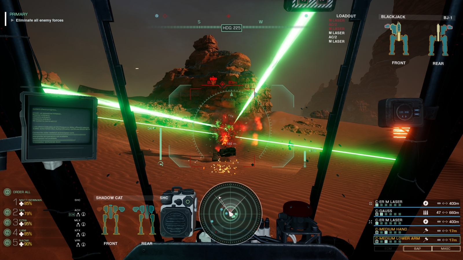 Our demo kicked off as our Star of five touched down and rendezvoused to investigate a trio of dropships that had landed deep in the desert. Approaching, our scans of the dropships revealed that they seem to be heavily shielded, but are also completely cold. Getting closer, we hit it with secondary and tertiary scans, but that only reveals that there isn’t a single reactor signature inside. Radioing in to Sarah Weaver, a saKhan for Clan Smoke Jaguar (Read: second in command for the Clan), she orders Layla, our Sultan Assault Transport pilot (if my aircraft identification is correct), to drop off some Elementals to crack the hull on the dropships while we head on to investigate where the mechs that were once inside are now.