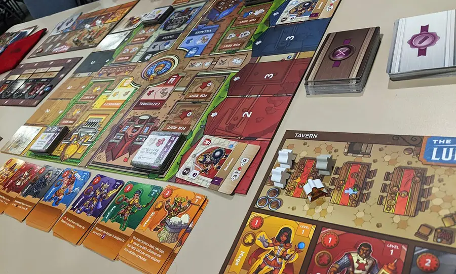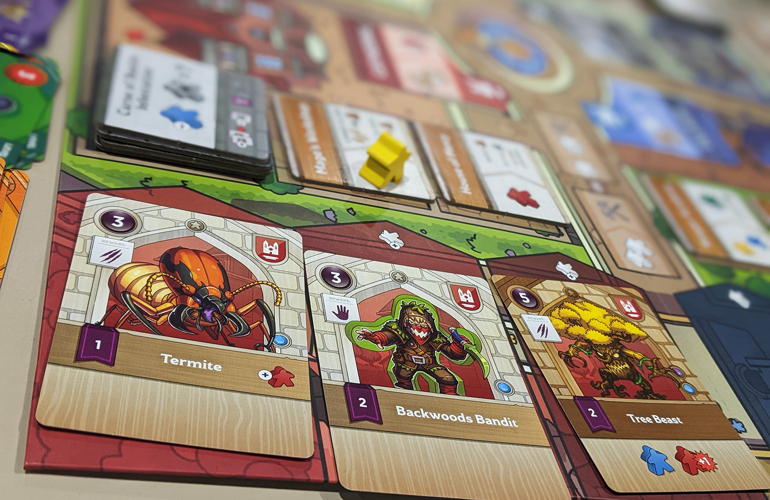 Picking up the flow of gameplay is easy, but the various quests, tiles, and king-of-the-hill mechanics add no shortage of complexity to any given game. Monsters appear on the board at the end of each round, and defeating them earns you monster card trophies as well as victory points, which allow you to advance up the leaderboard. You also have a set of quest cards, which reward you with victory points for achieving various requirements, such as having a certain number of classes in your tavern, defeating a certain kind or level of monster, etc. Completing these quests will also award you victory points, allowing you to move up the leaderboard, making the late game a mad-dash of trying to one-up your fellow players.