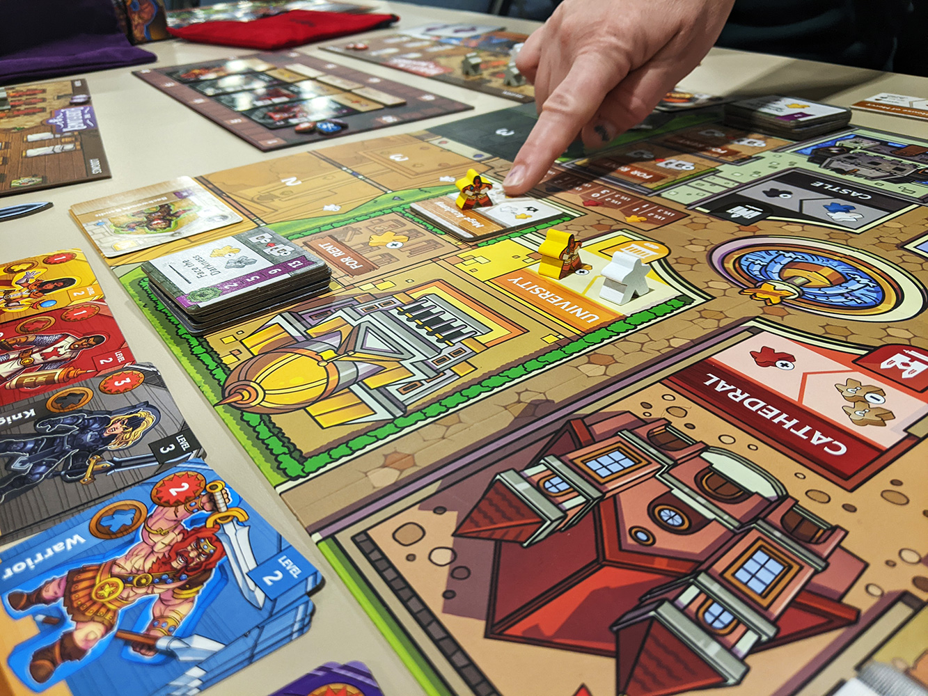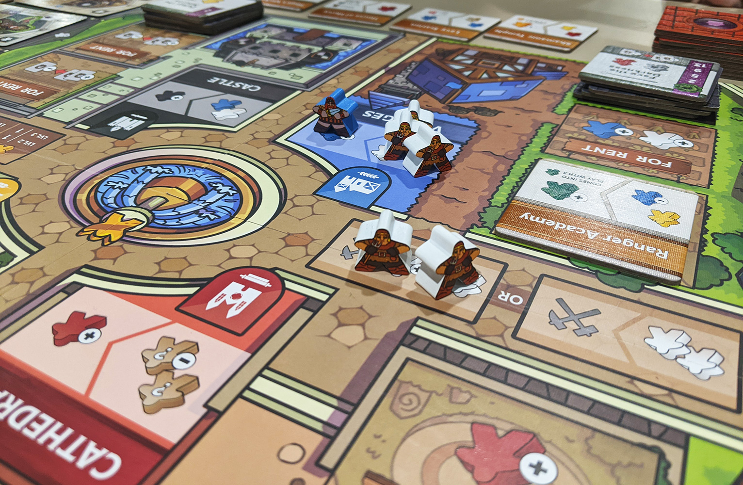 We got to sit down at PAX Unplugged to play a game of Meeples and Monsters. This simple-yet-complex bag building game is set in the city of Rowan, which is both underdeveloped and surrounded by monsters. In the early game, players focus on building a force of meeples, building resources, and upgrading their pool of meeples from peasants to clerics, warriors, mages, and knights. The late game sees players scrambling to one-up each other in completing missions, slaying monsters, and trying to secure the lead spot on the point board.