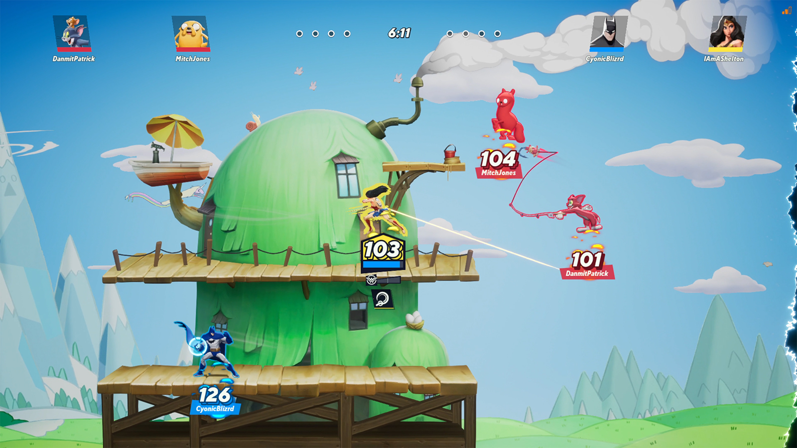 Each character has unique attacks that fit their personality. Shaggy grabs a sandwich from the ground and uses it as a projectile. Batman utilizes his various gadgets. Jake is stretchy and can turn into houses and cars. Wonder Woman snaps her lasso of truth at her enemies. Bugs Bunny drops safes and generates cartoon ACME rockets from thin air. I haven’t seen a character and think “That doesn’t look like something they would do.” It’s evident Player First Games took the time to make sure each character fights and moves in a way that’s consistent with their personality, particularly in an animated sense – Arya feels great in animated form, for example.