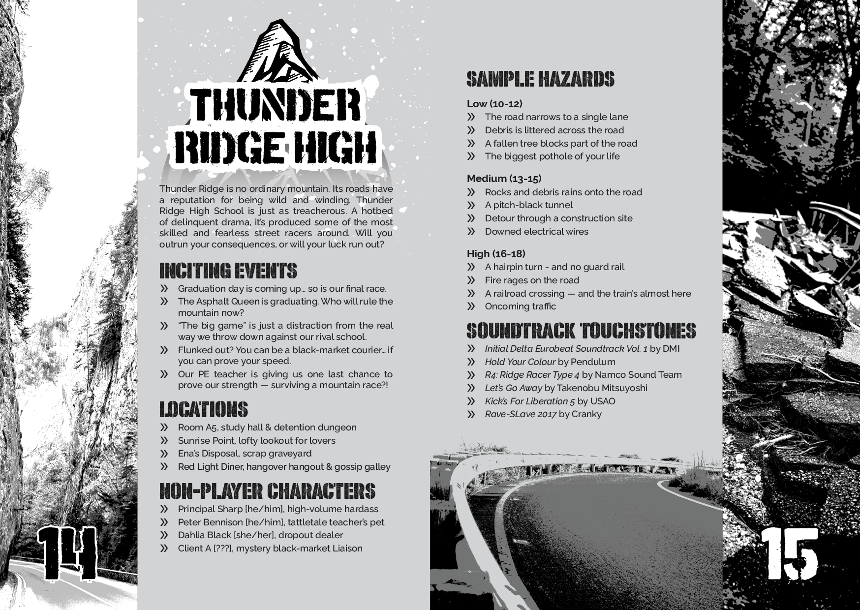 Players also have ways to add flair to the race itself, adding in complications to the roadway or hazards. These rules are all very light, as is the system itself. The speed of the exercise makes it easy to add these racing rules into an ongoing RPG, without the need for much modification at all.