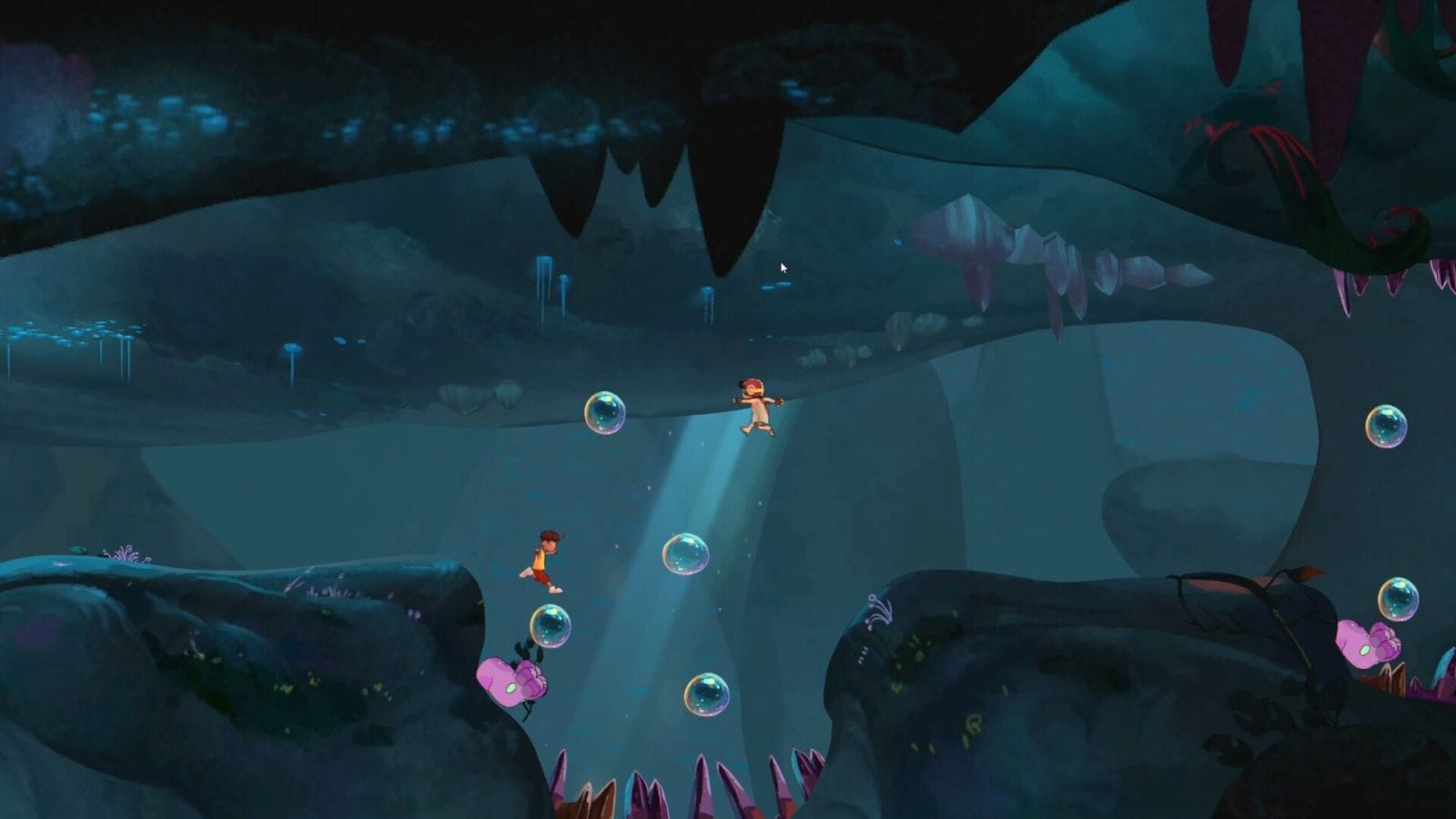 The adventures the trio go on will have players jumping between various puzzles and art styles, keeping things fresh without ever dipping in quality. Bounce through space on glowing platforms and warp through cosmic portals, fight a boss in a Cuphead-esque vignette, and navigate a mystical forest, manipulating ancient stonework as a team to help each other progress. There aren’t many controls, just jumping, grabbing, kicking, and walking. Even with the simplicity, every whimsical puzzle you overcome feels satisfying and well-made. If you only have two players, then don’t worry, because the AI is quite competent.