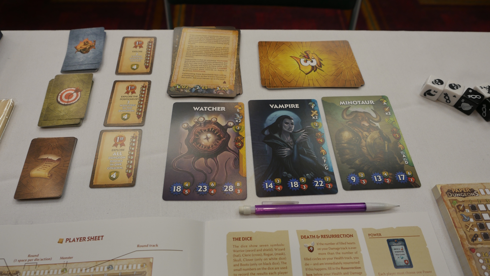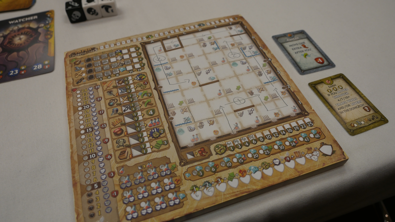 Most dice usage will not move you through the dungeon. Instead, you will level up and take actions to prepare for future encounters. Each class can be leveled up, providing powerful abilities. Artifacts can be found. Potions can be gathered. Whenever a skull is rolled on the dice, all players take damage. If you have potions, you can avoid some of the damage. Your total health is the sum of all your hero levels. If you ever take as much damage as you have health, you will have to resurrect, which comes at a cost of points.