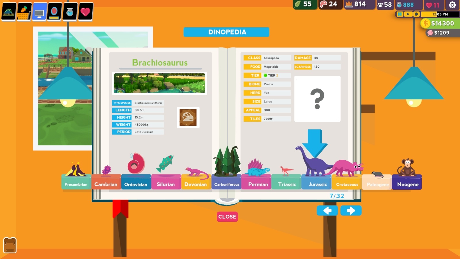 The all new Dinopedia, where you can find in-depth information about all the dinos in Parkasaurus.