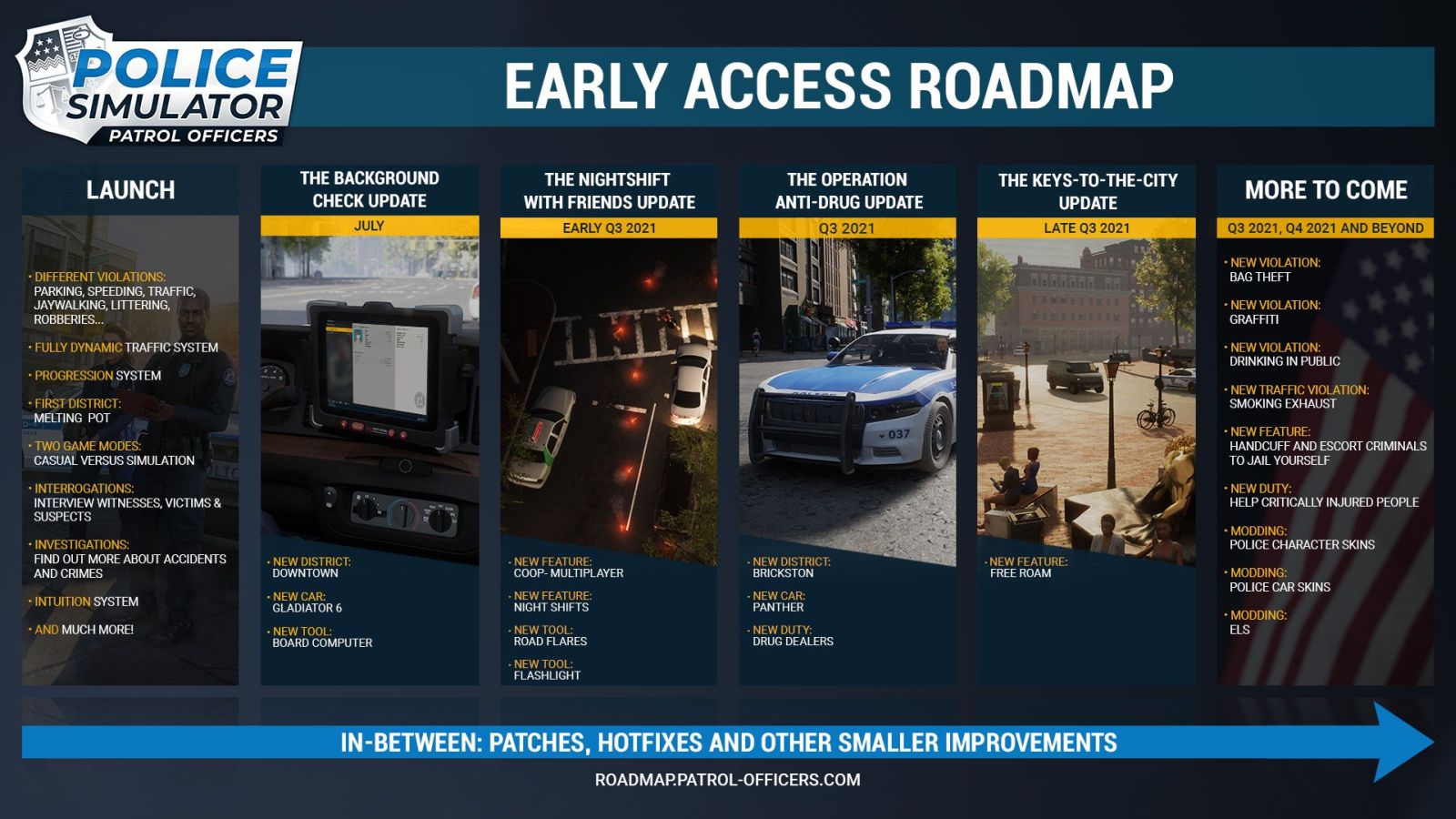 Mid Q3 brings another district to explore, another car, and a new duty just entitled “Drug Dealers”. Late Q3 introduces free roam for the city. Q4 and beyond brings bag theft, graffiti, drunk and disorderly, smog emissions on vehicles, escorting suspects to jail in handcuffs, medical support for civilians, and modding support. Given the number of shattered windshields I spotted, I’d hope that I’d be able to issue fix-it tickets on those soon enough as well.