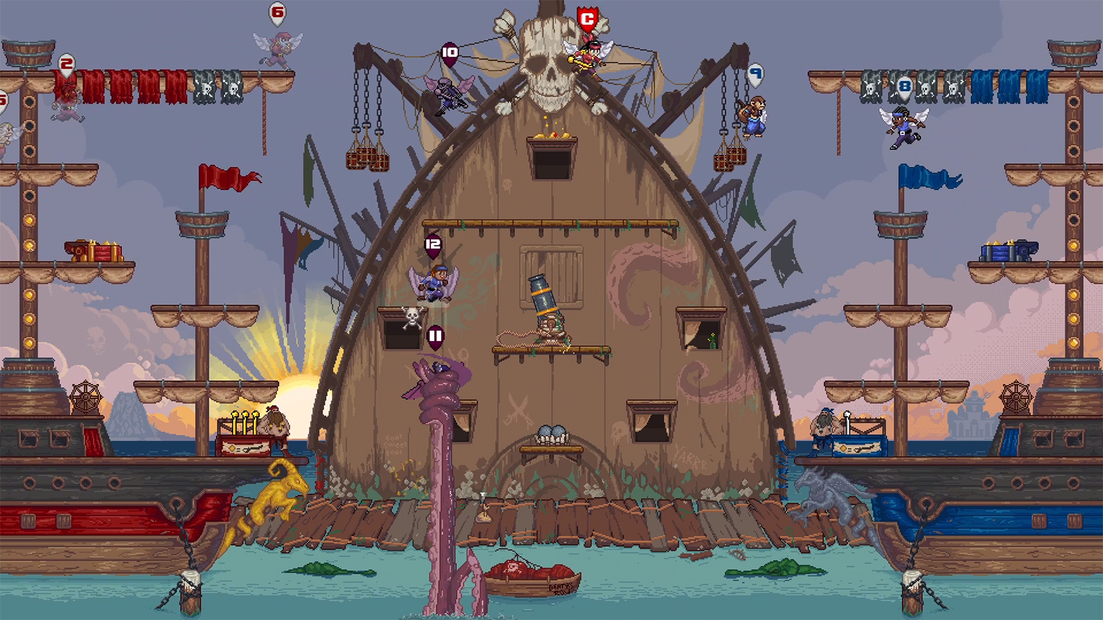If all the win conditions aren’t enough to create panic, throw items into the mix and it gets really zany. One item gives you wings to fly for a limited time which is really useful to plunder loot. Another item unleashes volcanic balls of fire down on the area it’s in, delivering an instant KO when touched. Another item looks like a Kraken doll that you can shoot at your foes and cover them in ink. That summons the actual Kraken who will track you and pull you into the watery depths if you’re not high enough to escape its quick grasp.