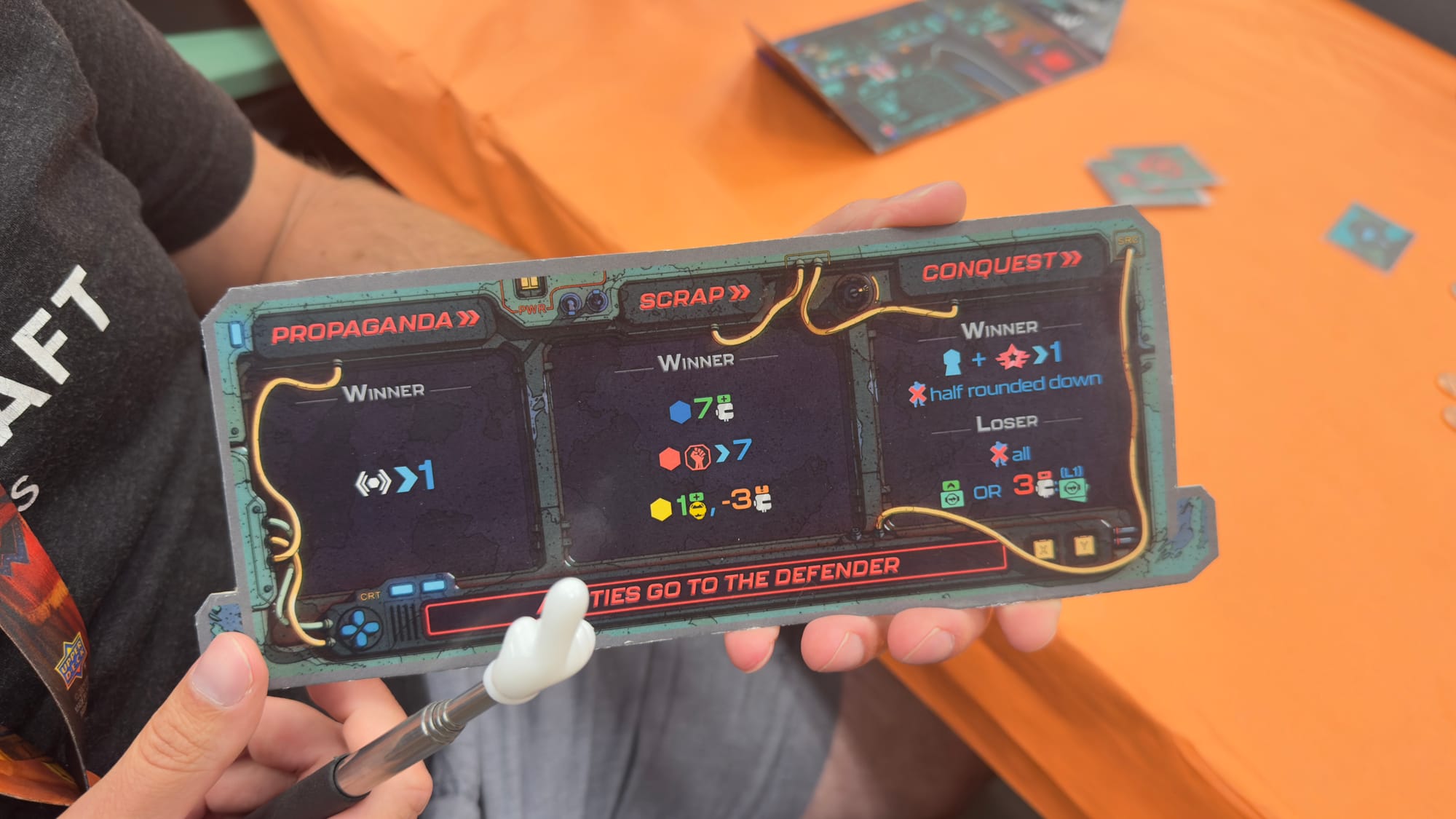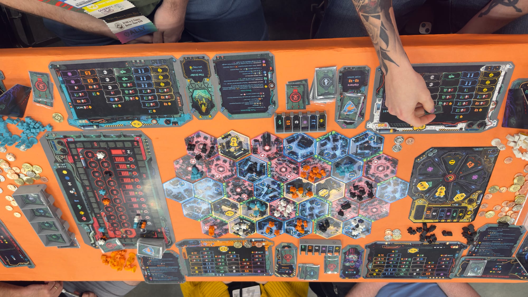 The other big highlight is combat resolution, which hits that elusive sweet spot of strategic and quick to resolve. Whenever someone rolls up on someone else's turf, boards and screens go out, and the participants allot their gear cards to control of the hex, doing violence, and getting points. It's beautiful, in a way that lets even a single guy threaten a horde with the gear to back it up: maintaining control may mean sacrificing a ton of plastic, unless you think they don't care about taking either and are just sending them in to reap the points. Could be, or you could just get blown out.