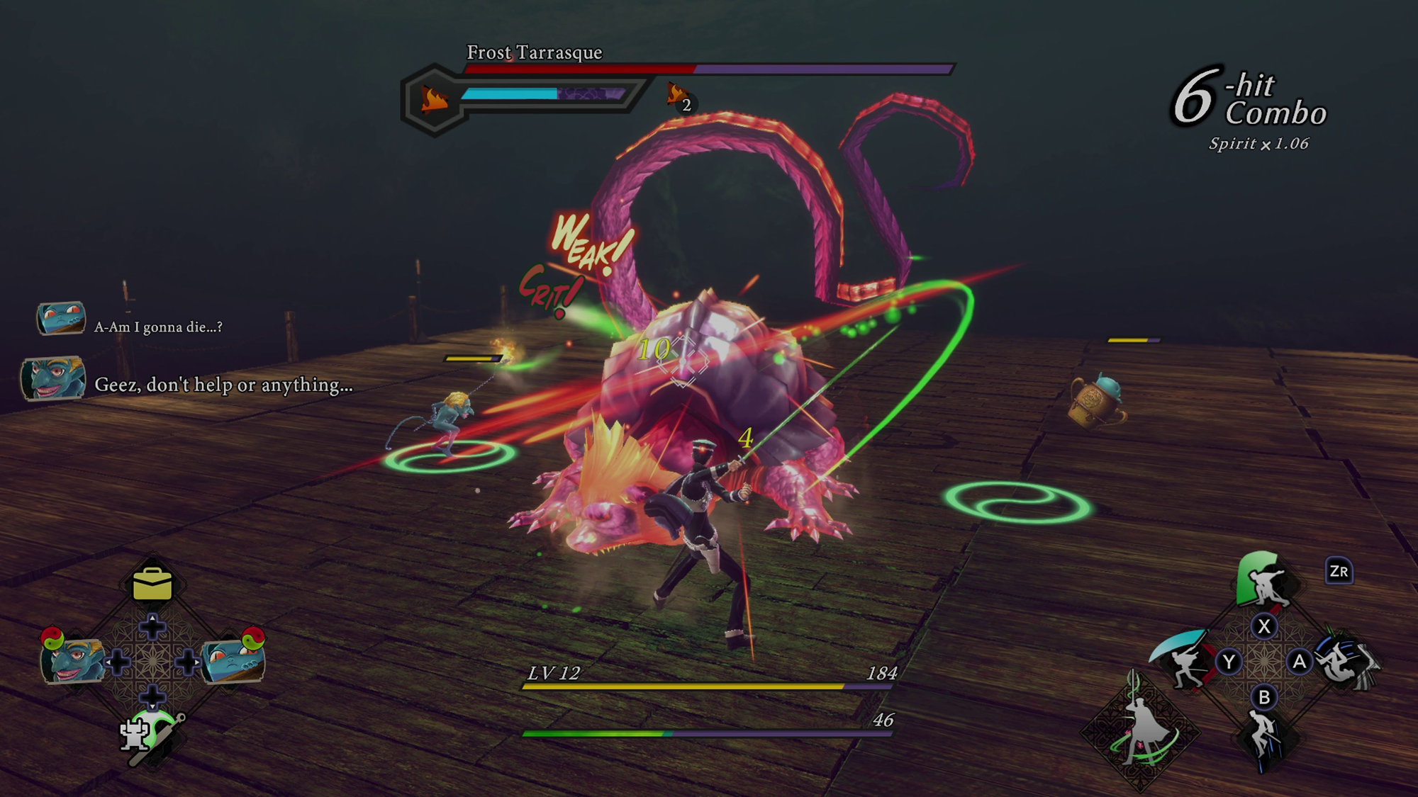 Your two swappable demon companions can help, as they all have different stats, abilities, weaknesses, strengths, etc. A lot of the enemies encountered in the basement area are weak to fire, so swapping in the demon Ukobach. He'd occasionally cast Agi, and with a held-down ZR trigger, Raidou can also cast magic, which can combo with the demon's magic.