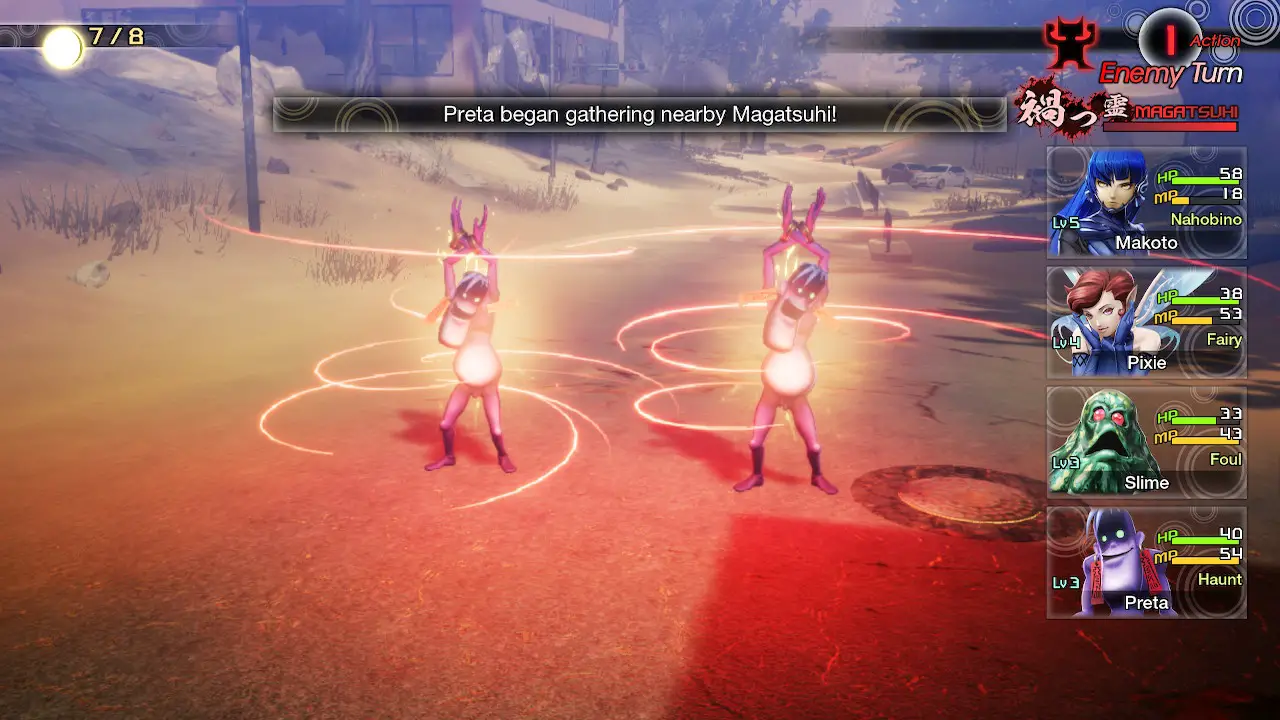 As the Nahobino, you actually stand a chance against Demons in combat. The Press Turn Battle System returns with some minor alterations, and if you’ve played any SMT game before you’ll feel right at home. For the basics: exploiting weaknesses gets you more turns, while missing or having your own weaknesses exploited removes turns or gives the enemy more. As per usual, the first demon you recruit is a Pixie but you can negotiate in combat to bring more to your side. Negotiation is still obtuse as hell (and I wouldn’t want it any other way) but conveniently if you do convince a demon to join you but your party is full or you’re too low a level they will remember you and you can recruit them for free later on.