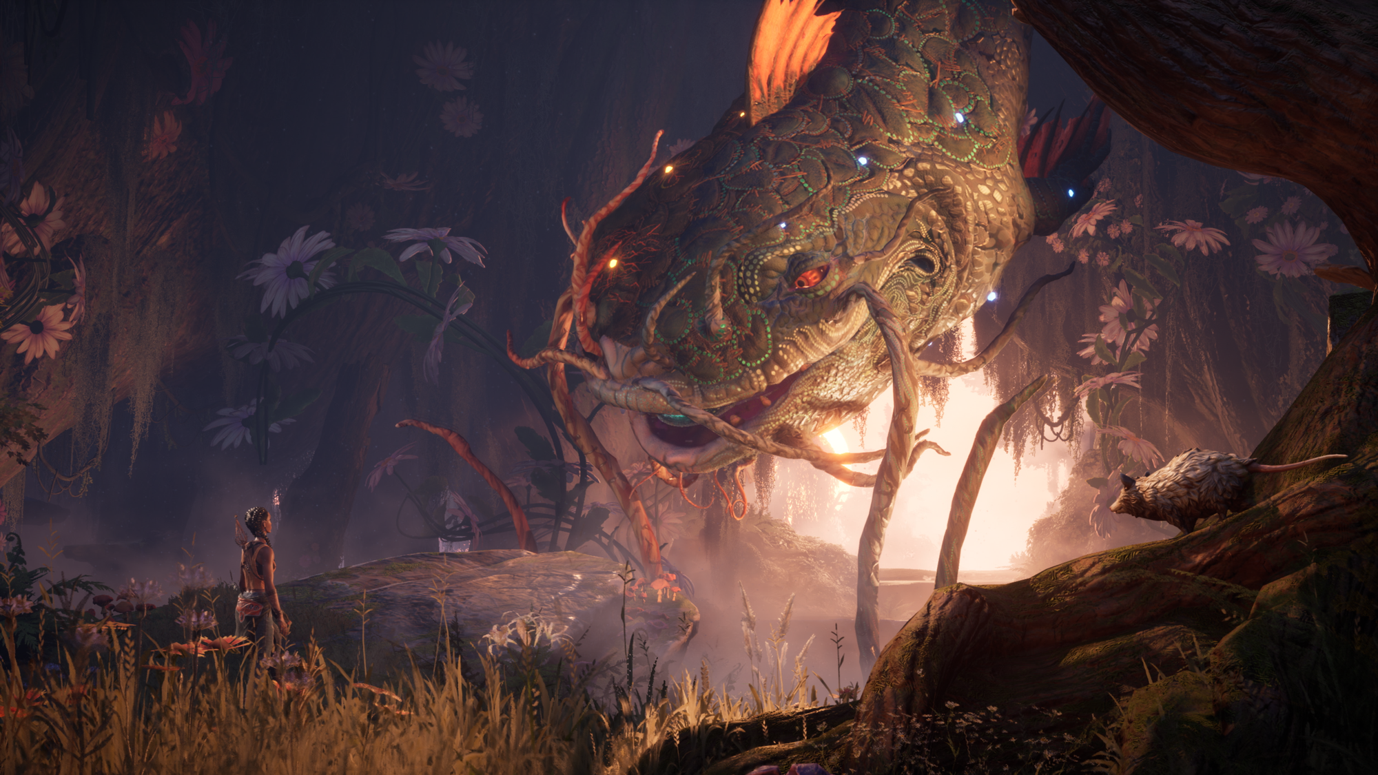 After clearing the Stigma, we continue along the path, eventually learning how to clear blocked pathways (RT), repair damaged structures (LB), double jump (A), and glide (B). We finally find ourselves in the bayou where we can see thorned roots emerging from the ground, snaking their way through the water, around trees, and off into the distance. A voice from afar beckons, and we meet our first companion, a giant catfish hanging from a tree. From here, we embark on a new adventure, navigating the heartbreaking story of two brothers before eventually bottling up the pain and putting things right, freeing Catfish in the process.