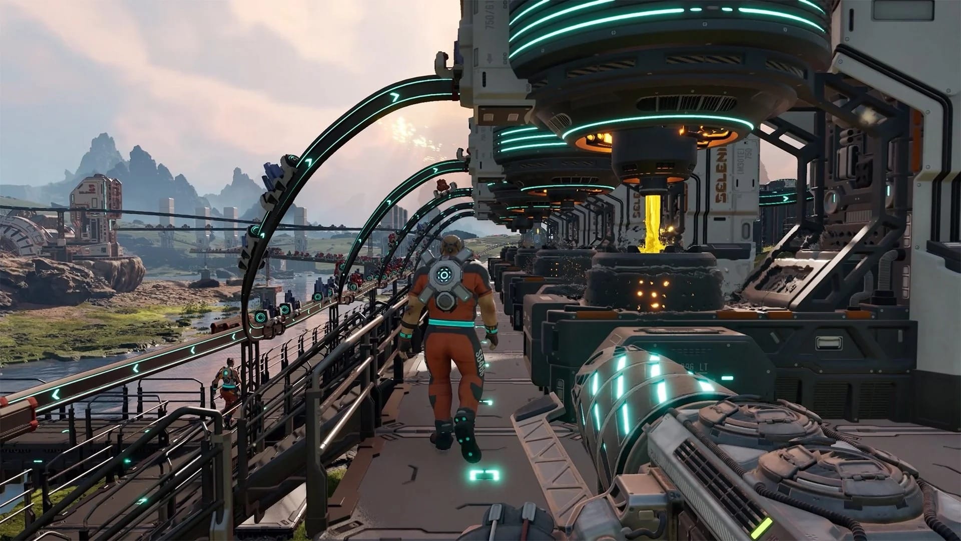There are a few base materials you'll carry around your factory, and a handful of different ways to store, delay, and route them for efficiency. The rails carry them to their destination, and naturally, you can upgrade their speed and capacity, but later unlocks allow you to split, divert, and reroute items around your base. Embracing verticality, you can run an entire highway of railing above your head without disrupting the walking space. It reminds me of a futuristic city with cars zipping every direction. Because of the versatility of the railing system, it's easy to reconfigure your outputs. Let's talk about where those output objects end up.
