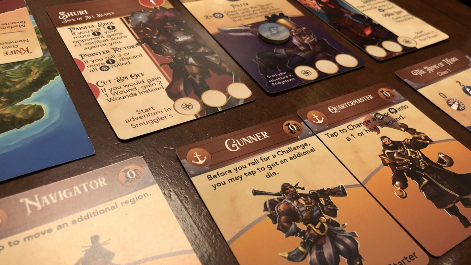 To start this sandbox pirate adventure, each player starts by choosing three cards that represent: the pirate captain they will be; a lover for their captain that provides bonuses; and a nemesis that hinders the captain. This game requires an app, which will be free to download on IOS and Android, that conveniently scans the cards and sets up all the adventures that are tied to each combination of captain, lover and nemesis. Each nemesis and lover have adventures associated with them, which, when completed by the player, increase the bonuses provided by the lover and decrease the negative effects of the nemesis. Interestingly, the app enables the effects of one player’s actions to impact the nemeses and lovers of the other players. For instance, during my demo, when I completed the series of adventures related to my captain’s lover, my opponent’s nemesis gained an ability that negatively affected my opponent.