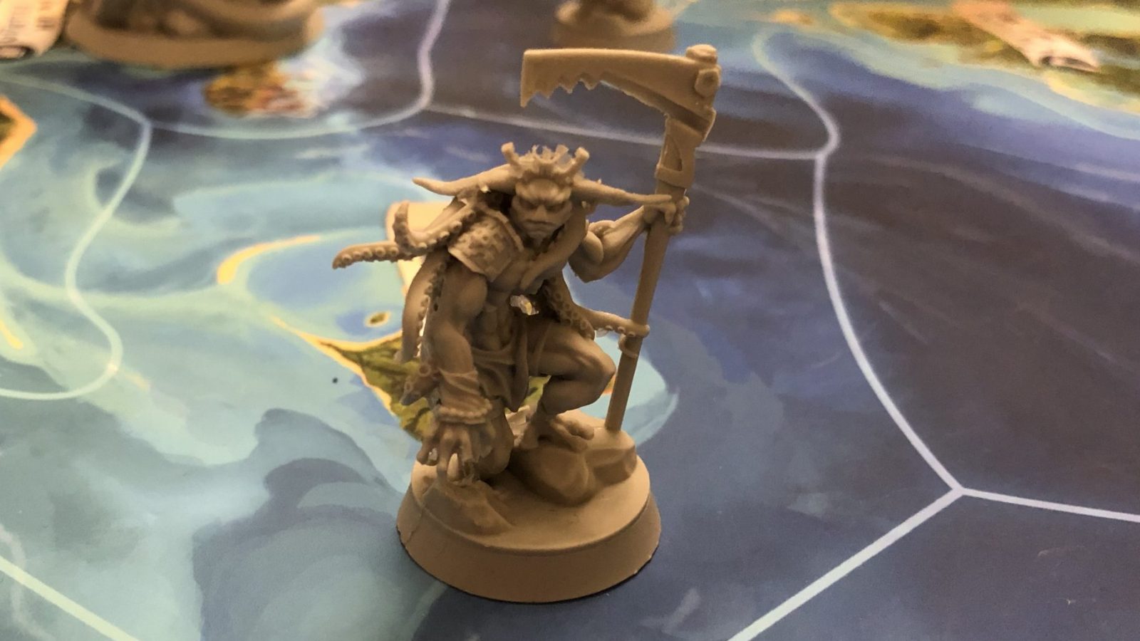 As part of the setup, the players also select a “World Event” that will provide a running theme throughout the game and adversaries above and beyond the basic Spanish ships sailing around. There will be four World Events in the base game and a planned expansion will provide another four. The World Event we played with added undead to the mix, with minis of skeletal conquistadors popping up on the map and marching to join up in the center with the goal of piling themselves together into a giant conquistador represented by a towering mini.
