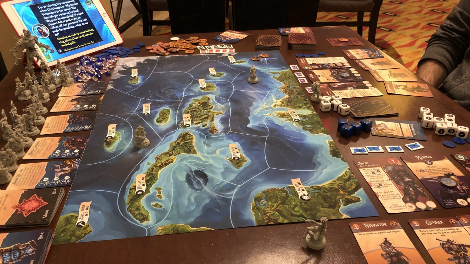 Once the World Event and characters are chosen and entered into the app, the players place the minis representing their characters on the map at a starting location of their choice. Three Spanish ships are placed on the map and the game is on. On their turn, players can do pretty much anything they want. The goal is to be the first player to earn ten notoriety. There are plenty of ways to get notoriety, and gold. You can take ports by attacking them and looting them; they will stay under your control and continue to provide you with gold until one of the Spanish ships takes it back. The only thing players have to remember is that the NPC faction related to the World Event can trigger a game ending condition that causes all players to lose, so players will want to keep tabs on that.