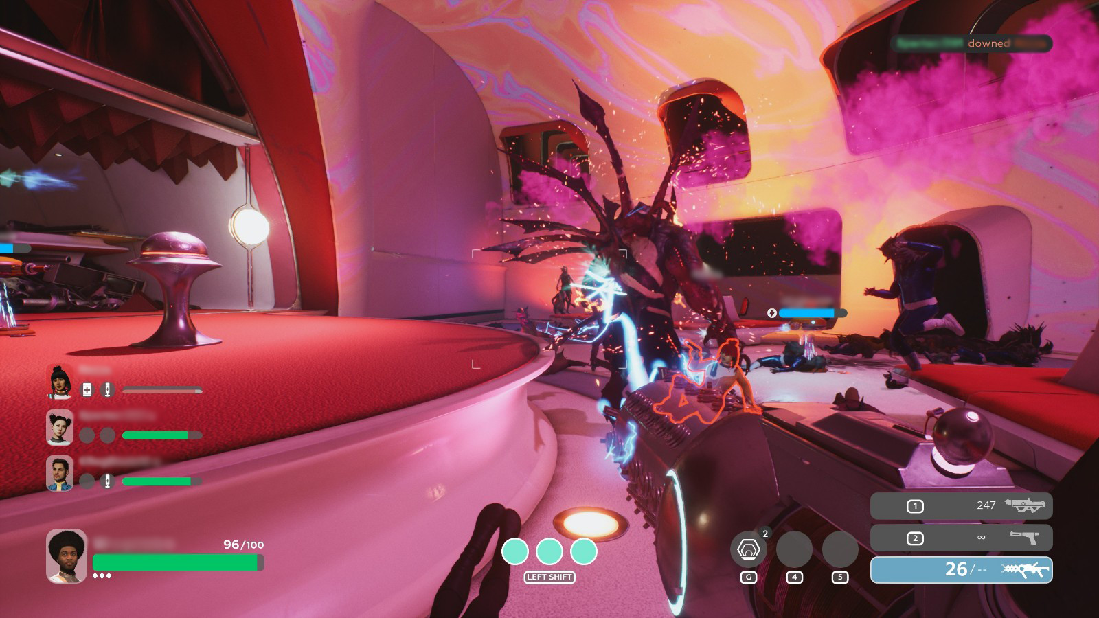 At the time of writing, three of the five planned episodes are available for play — each one broken up into a number of levels bookended by safe zones. Episodes are meaty and pose a tough challenge courtesy of the game’s dynamic difficulty engine. A cast of four characters with uniquely charming personalities light up the many rooms of the alien-infested starship. It’s barebones Left 4 Dead with a retro-futuristic twist; four players, four guns, a fistful of grenades, three special weapons, and the power of jolly cooperation are all you have to solve an alien mystery and escape with your lives.