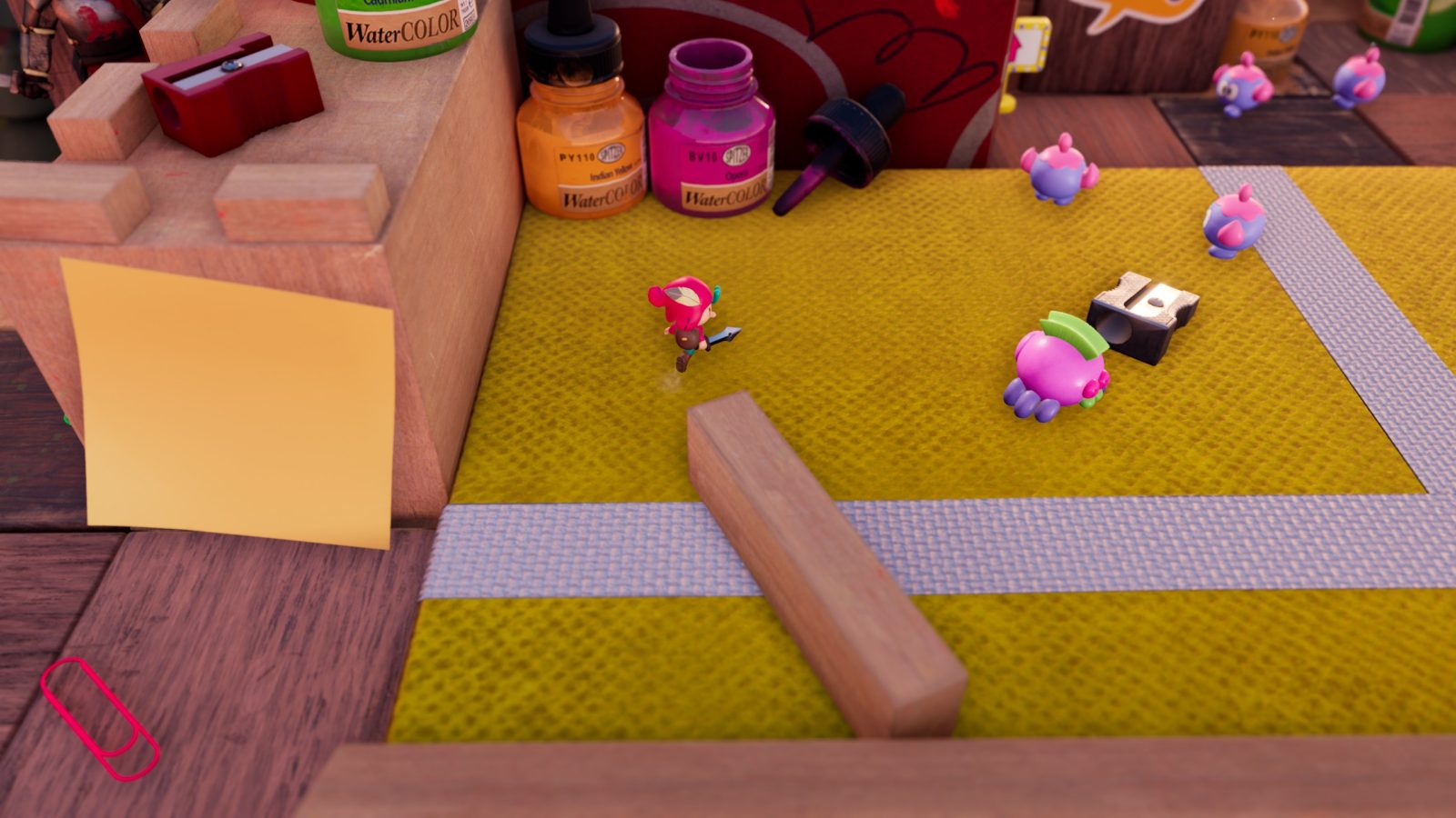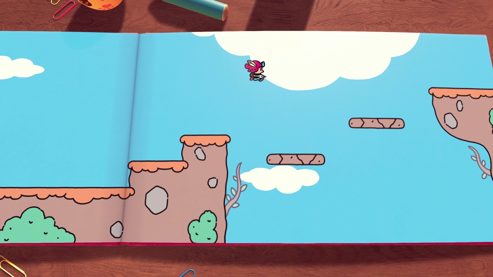 While word play puzzles are some of my favorite parts so far, sometimes Jot will need to further explore the real world to acquire tools and progress the narrative in his own story. To battle some bothersome bugs, Jot needs a long range weapon. There’s a Magic: The Gathering style card depicting an elven woman wielding a bow, though it’s pretty far away. You need to battle, platform, and puzzle your way to it by moving in and out of Sam’s (the boy who owns the book) drawings. You might need a spring to bounce on to reach a high platform, so you find it within a scrap of paper and bring it with you back to the real world.